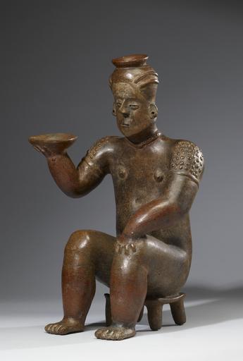 | Keywords: Colima - Seated Female Figure - Walters 20092053 - Three Quarter Left.jpg The Coahuayana River Valley was home to many large villages and towns and their artists produced a distinctive local version of the large hollow tomb figure Coahuayana figural art is characterized by elegant renderings of persons of authority Most portrayals lack individuality and instead serve as sculptural representations of social position or political rank This seated female's serene countenance shoulder scarification patterns necklace and pierced ears denote a person of high status The artist accentuated the figure with red slip enhancing her hair forearms and legs below the knee Her identification as a person of authority is further indicated by her sitting on a four-legged stool or bench; this type of seating was closely associated with elevated status throughout the ancient Americas She raises a small dish in her right hand as if proffering its contents to unseen persons perhaps participants in an aristocratic feasting event 100 BC-AD 300 earthenware burnished red slip paint with resist designs in black cm 49 5 30 5 24 8 accession number 2009 20 53 80208 Stendhal Galleries Los Angeles date and mode of acquisition unknown John G Bourne 1940s by purchase Walters Art Museum Gift of John Bourne 2009 place of origin Michoacán Mexico Walters Art Museum license Objects from Colima in the Walters Art Museum Media contributed by the Walters Art Museum needs category review |