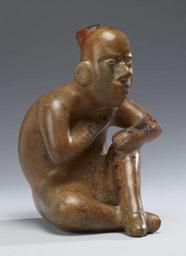 | Keywords: Colima - Seated Figure - Walters 20092016 - Three Quarter Right.jpg The valleys of the Río Armería and Río Coahuayana which drain the mountains of the modern Mexican state of Colima nurtured the development of a robust culture Although the peoples' names and languages are lost to time their vitality is preserved in remarkable ceramic sculptures and a pottery vessel tradition that are unique in Mesoamerica Yet these artworks also incorporate a variety of features found among many Mexican societies thereby indicating ancient Colima's membership in the greater Mesoamerican community Colima's hollow figural art characterized by its monochrome orange-red or deep red slip palette is one of the most unified artistic statements of Mesoamerica The surfaces were highly burnished to achieve a bright shine interrupted only by black manganese staining resulting from a natural corrosive process Here the sculptor draws attention away from the engaging figure by highlighting the vessel's orifice with deep red slip paint The sculptor's mastery of the human form is seen in the adept rendering of the twist of the back as the figure leans forward on his bent knee The acuteness of the twist however may also depict a skeletal defect The figure's gesture-right hand held to the chest-is a pan-Mesoamerican sign of deference 100 BC-AD 300 Comala Phase earthenware burnished slip in red and light brown cm 25 2 18 21 5 accession number 2009 20 16 80171 Stendahl Galleries Los Angeles date and mode of acquisition unknown John G Bourne 1980s by purchase Walters Art Museum Gift of John Bourne 2009 place of origin Colima Mexico Walters Art Museum license Objects from Colima in the Walters Art Museum Media contributed by the Walters Art Museum needs category review |