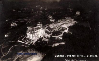 Keywords: Vista dall'alto sul complesso del colle Campigli. A sinistra il Palace Hotel (arch. Giuseppe Sommaruga e ing. Giulio Macchi, 1912), la massiccia mole del teatro del Kursaal (arch. Giuseppe Sommaruga e ing. Giulio Macchi, 1911) e a seguire il resto del complesso ricreativo del Kursaal (arch. Gaetano Moretti, 1905) con al centro l'alto salone vetrato. Tutti gli elementi sono raccordati tramite la passeggiata coperta (Kolonnade) che ha al centro la stazione superiore della funicolare che porta in via Sanvito Silvestro. varese palacehotel kursaal |