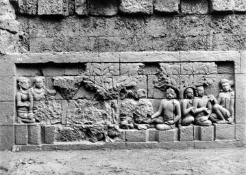 Keywords: COLLECTIE TROPENMUSEUM Reliëf O 46 op de verborgen voet van de Borobudur TMnr 10015783.jpg nl Negatief Negatief waarop reliëf O 46 van de verborgen voet van de Borobudur te zien is De verborgen voet van de Borobudur is de oorspronkelijke basis van het Buddhistische heiligdom dat rond 800 gebouwd is In een latere fase van de bouw werd deze basis verborgen waarschijnlijk om verzakking te verkomen De verborgen voet loopt om het hele bouwwerk heen en bevat 160 reliëfs die tezamen de Mahakarmawibhangga verbeelden een Mahayanistische tekst die de werking van de leer van Karma uiteenzet Deze leerrede wordt aan Buddha toegeschreven en handelt over oorzaak en gevolg N J Krom en Th van Erp duiden in hun standaardwerk over de Borobudur Beschrijving van Barabudur Den Haag Martinus Nijhoff 1920-1931 de reliëfs van de verborgen voet aan als serie O Op de reliëfs zijn voorbeelden van de theorie uitgebeeld goede daden hebben goede gevolgen en slechte daden hebben slechte gevolgen De reliëfs vallen in twee delen uiteen O 1 tot en met O 117 verbeelden een aantal daden die leiden tot één en hetzelfde gevolg De reliëfs O 118 tot en met O 160 tonen verschillende gevolgen van één oorzaak De uiteenzetting van de leer begint bij de trap aan de oostzijde en ontrolt zich met de klok mee om het bouwwerk heen De reliëfs moeten dan ook gelezen worden van rechts naar links Lange tijd was onbekend wat op de reliëfs van de verborgen voet stond afgebeeld Hoewel de reliëfs al in 1885 waren ontdekt door Dr Ir J W IJzerman 1851-1932 kon de Franse geleerde Sylvain Lévi pas in 1929 op het zesde Congres van het Oostersch Genootschap constateren dat het op de verborgen voet ging om een Buddhistische tekst Mahakarmawibhangga Lévi had in 1922 een manuscript uit 1411 met deze tekst ontdekt in Kathmandu Nepal De tekst bleek populair in de Burdhistische wereld te zijn en een aantal verwante teksten te hebben twee Chinese werken waarvan één vertaald was in 582 door Gautama Dharmaprajna en één tussen 980 en 1000 door T'ien si Tsai Daarnaast bevat de Tibetaanse Kanjur twee werken met de titel Karmawibhangga In 1933 publiceerde de archeoloog N J Krom een uitgebreide analyse van het Mahakarmawibhangga op de reliëfs van de bedolven voet Hierin legt hij een relatie tussen de afbeeldingen op de reliëfs en de tekstpassages in het Mahakarmawibhangga Reliëf O 46 bevindt zich aan de zuidzijde van de Borobudur en correspondeert volgens N J Krom met de achtste paragraaf van het Mahakarmawibhangga Wat is de daad die het een voornaam persoon zijn ten gevolge heeft Antwoord zich onthouden van ijverzucht; zich onthouden van afgunst; tevredenheid over het voordeel van een ander; tevredenheid bij het horen van lof prijs en huldiging van een ander; ingenomenheid met de lofspraak op een ander; het oprichten van caitya's en stupa's van Bhagawan; het afwenden van nietswaardigen lieden die de Wet niet houden en verstoken zijn van de wortelen des goeds; het aanzetten tot de wortelen des goeds voor voorname personen; de gedachte van het Inzicht te voorschijn brengen; de gedachte van het Inzicht in alle wortelen des goeds voorvoorname personen tevoorschijn brengen Zoals Dat is de daad die het een voornaam persoon zijn ten gevolge heeft Uit N J Krom Het Karmawibhangga op Barabudur Mededeelingen der koninklijke academie van wetenschappen afdeeling letterkunde deel 76 serie B No 8 Amsterdam Noordhollandsche Uitgevers-Maatschappij 1933 226 Deze paragraaf heeft betrekking op reliëfs O 40 tot en met O 47 die hier en daar beschadigd zijn Volgens Krom zou op O 46a de gedachte van het Inzicht uitgebeeld kunnen zijn Bronnen A J Bernet Kempers Borobudur Mysteriegebeuren in steen Verval en restauratie Oudjavaans volksleven Wassenaar 1973/gewijzigde herdruk ; Van Erp Th Krom N J Beschrijving van Barabudur Den Haag Martinus Nijhoff 1920-1931 ; N J Krom Het Karmawibhangga op Barabudur Mededeelingen der koninklijke academie van wetenschappen afdeeling letterkunde deel 76 serie B No 8 Amsterdam Noordhollandsche Uitgevers-Maatschappij 1933 Reliëf O 46 op de verborgen voet van de Borobudur 1890-1891 institution Tropenmuseum KIT-source 10015783 Creator Kassian Cephas KIT-license PD-old-100 Photographs by Kassian Cephas Tropenmuseum Borobudur reliefs Borobudur in 1890 Black and white photographs |
