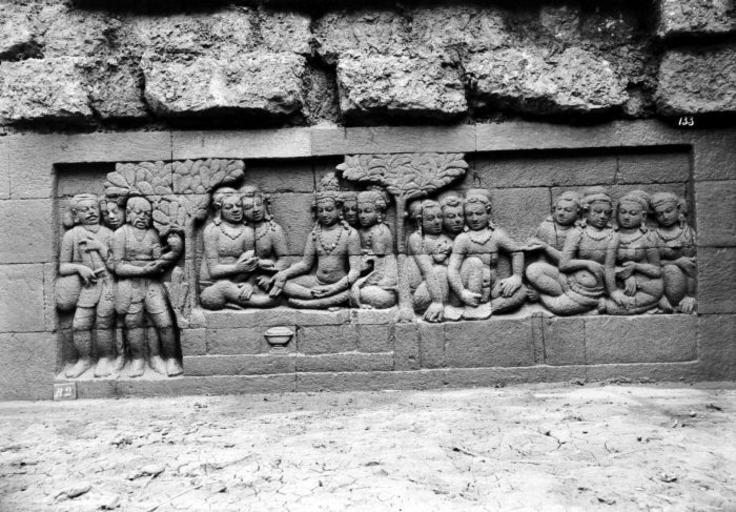 Keywords: COLLECTIE TROPENMUSEUM Reliëf O 48 op de verborgen voet van de Borobudur TMnr 10015786.jpg nl Negatief Negatief waarop reliëf O 48 van de verborgen voet van de Borobudur te zien is De verborgen voet van de Borobudur is de oorspronkelijke basis van het Buddhistische heiligdom dat rond 800 gebouwd is In een latere fase van de bouw werd deze basis verborgen waarschijnlijk om verzakking te verkomen De verborgen voet loopt om het hele bouwwerk heen en bevat 160 reliëfs die tezamen de Mahakarmawibhangga verbeelden een Mahayanistische tekst die de werking van de leer van Karma uiteenzet Deze leerrede wordt aan Buddha toegeschreven en handelt over oorzaak en gevolg N J Krom en Th van Erp duiden in hun standaardwerk over de Borobudur Beschrijving van Barabudur Den Haag Martinus Nijhoff 1920-1931 de reliëfs van de verborgen voet aan als serie O Op de reliëfs zijn voorbeelden van de theorie uitgebeeld goede daden hebben goede gevolgen en slechte daden hebben slechte gevolgen De reliëfs vallen in twee delen uiteen O 1 tot en met O 117 verbeelden een aantal daden die leiden tot één en hetzelfde gevolg De reliëfs O 118 tot en met O 160 tonen verschillende gevolgen van één oorzaak De uiteenzetting van de leer begint bij de trap aan de oostzijde en ontrolt zich met de klok mee om het bouwwerk heen De reliëfs moeten dan ook gelezen worden van rechts naar links Lange tijd was onbekend wat op de reliëfs van de verborgen voet stond afgebeeld Hoewel de reliëfs al in 1885 waren ontdekt door Dr Ir J W IJzerman 1851-1932 kon de Franse geleerde Sylvain Lévi pas in 1929 op het zesde Congres van het Oostersch Genootschap constateren dat het op de verborgen voet ging om een Buddhistische tekst Mahakarmawibhangga Lévi had in 1922 een manuscript uit 1411 met deze tekst ontdekt in Kathmandu Nepal De tekst bleek populair in de Burdhistische wereld te zijn en een aantal verwante teksten te hebben twee Chinese werken waarvan één vertaald was in 582 door Gautama Dharmaprajna en één tussen 980 en 1000 door T'ien si Tsai Daarnaast bevat de Tibetaanse Kanjur twee werken met de titel Karmawibhangga In 1933 publiceerde de archeoloog N J Krom een uitgebreide analyse van het Mahakarmawibhangga op de reliëfs van de bedolven voet Hierin legt hij een relatie tussen de afbeeldingen op de reliëfs en de tekstpassages in het Mahakarmawibhangga Reliëf O 48 bevindt zich aan de zuidzijde van de Borobudur en correspondeert volgens N J Krom met de negende paragraaf van het Mahakarmawibhangga Wat is de daad die een lage geboorte ten gevolge heeft Antwoord ongenaakbaarheid; inbeelding; het niet erkennen van vader en moeder; het niet handelen volgens sramana-regels; het niet handelen volgens brahmanen-regels; het te kort doen aan de eervied voor de oudste van het geslacht; het niet ten dienste staan van vader en moeder; het niet ten dienste staan van edele deugdzame lieden en het niet ten dienste staan van anderen die de plaats van guru vervullen leermeester en onderrichtgevers; het geringschatten van lieden van lage geboorte Dat is de daad die een lage geboorte ten gevolge heeft Uit N J Krom Het Karmawibhangga op Barabudur Mededeelingen der koninklijke academie van wetenschappen afdeeling letterkunde deel 76 serie B No 8 Amsterdam Noordhollandsche Uitgevers-Maatschappij 1933 226 Deze passage heeft betrekking op de reliëfs O 48 tot en met O 53 Op de linkerhelft van deze reliëfs zien we figuren van lage afkomst Op O 48a en O 48b vinden gesprekken plaats Alleen aan de hand van de tekst meent Krom in deze taferelen de verbeelding van ongenaakbaarheid te kunnen zien Één van de hoofdpersonen van O 48a lijkt een afwijzende houding aan te nemen aldus Krom Bronnen A J Bernet Kempers Borobudur Mysteriegebeuren in steen Verval en restauratie Oudjavaans volksleven Wassenaar 1973/gewijzigde herdruk ; Van Erp Th Krom N J Beschrijving van Barabudur Den Haag Martinus Nijhoff 1920-1931 ; N J Krom Het Karmawibhangga op Barabudur Mededeelingen der koninklijke academie van wetenschappen afdeeling letterkunde deel 76 serie B No 8 Amsterdam Noordhollandsche Uitgevers-Maatschappij 1933 Reliëf O 48 op de verborgen voet van de Borobudur 1890-1891 institution Tropenmuseum KIT-source 10015786 Creator Kassian Cephas KIT-license PD-old-100 Photographs by Kassian Cephas Tropenmuseum Borobudur reliefs Borobudur in 1890 Black and white photographs |