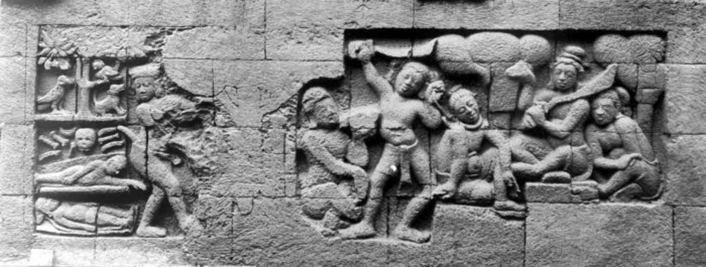 Keywords: COLLECTIE TROPENMUSEUM Reliëf O 4 op de verborgen voet van de Borobudur TMnr 10015742.jpg nl Repronegatief Negatief waarop reliëf O 4 van de verborgen voet van de Borobudur te zien is De verborgen voet van de Borobudur is de oorspronkelijke basis van het Buddhistische heiligdom dat rond 800 gebouwd is In een latere fase van de bouw werd deze basis verborgen waarschijnlijk om verzakking te verkomen De verborgen voet loopt om het hele bouwwerk heen en bevat 160 reliëfs die tezamen de Mahakarmawibhangga verbeelden een Mahayanistische tekst die de werking van de leer van Karma uiteenzet Deze leerrede wordt aan Buddha toegeschreven en handelt over oorzaak en gevolg N J Krom en Th van Erp duiden in hun standaardwerk over de Borobudur Beschrijving van Barabudur Den Haag Martinus Nijhoff 1920-1931 de reliëfs van de verborgen voet aan als serie O Op de reliëfs zijn voorbeelden van de theorie uitgebeeld goede daden hebben goede gevolgen en slechte daden hebben slechte gevolgen De reliëfs vallen in twee delen uiteen O 1 tot en met O 117 verbeelden een aantal daden die leiden tot één en hetzelfde gevolg De reliëfs O 118 tot en met O 160 tonen verschillende gevolgen van één oorzaak De uiteenzetting van de leer begint bij de trap aan de oostzijde en ontrolt zich met de klok mee om het bouwwerk heen De reliëfs moeten dan ook gelezen worden van rechts naar links Lange tijd was onbekend wat op de reliëfs van de verborgen voet stond afgebeeld Hoewel de reliëfs al in 1885 waren ontdekt door Dr Ir J W IJzerman 1851-1932 kon de Franse geleerde Sylvain Lévi pas in 1929 op het zesde Congres van het Oostersch Genootschap constateren dat het op de verborgen voet ging om een Buddhistische tekst Mahakarmawibhangga Lévi had in 1922 een manuscript uit 1411 met deze tekst ontdekt in Kathmandu Nepal De tekst bleek populair in de Burdhistische wereld te zijn en een aantal verwante teksten te hebben twee Chinese werken waarvan één vertaald was in 582 door Gautama Dharmaprajna en één tussen 980 en 1000 door T'ien si Tsai Daarnaast bevat de Tibetaanse Kanjur twee werken met de titel Karmawibhangga In 1933 publiceerde de archeoloog N J Krom een uitgebreide analyse van het Mahakarmawibhangga op de reliëfs van de bedolven voet Hierin legt hij een relatie tussen de afbeeldingen op de reliëfs en de tekstpassages in het Mahakarmawibhangga Reliëf O 4 bevindt zich aan de oostzijde van de Borobudur en correspondeert volgens N J Krom met de eerste paragraaf van het Mahakarmawibhangga Wat is dan de daad die een kort leven ten gevolge heeft Antwoord de aanslag op het leven; het zich verheugen over een aanslag op het leven het prijzen van een aanslag op het leven; het genoegen scheppen in de dood van een vijand; het aanzetten tot de dood van een vijand; het prijzen van de dood van een vijand; de vruchtafdrijving; het prijzen van de vruchtafdrijving; het inrichten van een terrein waar veel levende wezens gedood worden buffels vee varkens hanen enz terwijl van de brenger van het offer de kinderen en kindskinderen en andere mensen uit winstbejag en vrees hem navolgend levende wezens doden Zoals een bedelmonnik in de grote stad Kasmira Uit N J Krom Het Karmawibhangga op Barabudur Mededeelingen der koninklijke academie van wetenschappen afdeeling letterkunde deel 76 serie B No 8 Amsterdam Noordhollandsche Uitgevers-Maatschappij 1933 218 Op reliëf O 4 is de plaats te zien waar levende wezens worden gedood Hierbij merkt Krom op dat het hier gaat om mensen en niet om dieren zoals in de tekst wordt vermeld Het kerhof dat te zien is op O 4b sluit hierop aan Dit deel van het reliëf is echter gedeeltelijk onafgewerkt Bronnen A J Bernet Kempers Borobudur Mysteriegebeuren in steen Verval en restauratie Oudjavaans volksleven Wassenaar 1973/gewijzigde herdruk ; Van Erp Th Krom N J Beschrijving van Barabudur Den Haag Martinus Nijhoff 1920-1931 ; N J Krom Het Karmawibhangga op Barabudur Mededeelingen der koninklijke academie van wetenschappen afdeeling letterkunde deel 76 serie B No 8 Amsterdam Noordhollandsche Uitgevers-Maatschappij 1933 Reliëf O 4 op de verborgen voet van de Borobudur 1890-1891 institution Tropenmuseum KIT-source 10015742 Creator Kassian Cephas KIT-license PD-old-100 Photographs by Kassian Cephas Tropenmuseum Borobudur reliefs Borobudur in 1890 Black and white photographs |