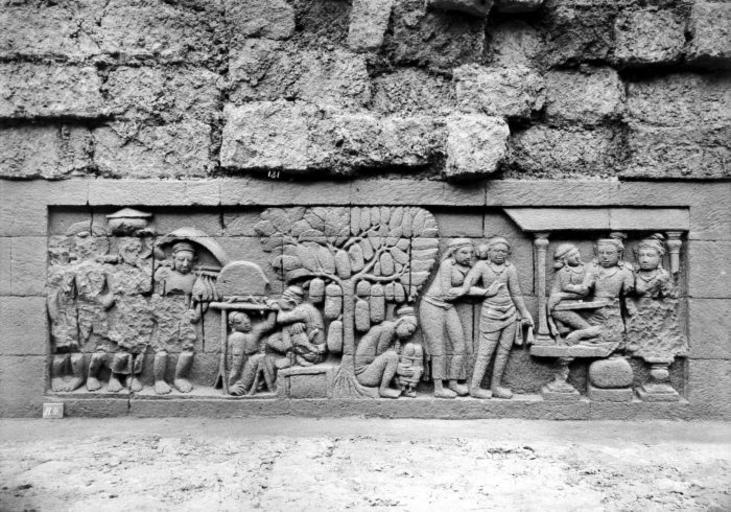 Keywords: COLLECTIE TROPENMUSEUM Reliëf O 50 op de verborgen voet van de Borobudur TMnr 10015788.jpg nl Negatief Negatief waarop reliëf O 50 van de verborgen voet van de Borobudur te zien is De verborgen voet van de Borobudur is de oorspronkelijke basis van het Buddhistische heiligdom dat rond 800 gebouwd is In een latere fase van de bouw werd deze basis verborgen waarschijnlijk om verzakking te verkomen De verborgen voet loopt om het hele bouwwerk heen en bevat 160 reliëfs die tezamen de Mahakarmawibhangga verbeelden een Mahayanistische tekst die de werking van de leer van Karma uiteenzet Deze leerrede wordt aan Buddha toegeschreven en handelt over oorzaak en gevolg N J Krom en Th van Erp duiden in hun standaardwerk over de Borobudur Beschrijving van Barabudur Den Haag Martinus Nijhoff 1920-1931 de reliëfs van de verborgen voet aan als serie O Op de reliëfs zijn voorbeelden van de theorie uitgebeeld goede daden hebben goede gevolgen en slechte daden hebben slechte gevolgen De reliëfs vallen in twee delen uiteen O 1 tot en met O 117 verbeelden een aantal daden die leiden tot één en hetzelfde gevolg De reliëfs O 118 tot en met O 160 tonen verschillende gevolgen van één oorzaak De uiteenzetting van de leer begint bij de trap aan de oostzijde en ontrolt zich met de klok mee om het bouwwerk heen De reliëfs moeten dan ook gelezen worden van rechts naar links Lange tijd was onbekend wat op de reliëfs van de verborgen voet stond afgebeeld Hoewel de reliëfs al in 1885 waren ontdekt door Dr Ir J W IJzerman 1851-1932 kon de Franse geleerde Sylvain Lévi pas in 1929 op het zesde Congres van het Oostersch Genootschap constateren dat het op de verborgen voet ging om een Buddhistische tekst Mahakarmawibhangga Lévi had in 1922 een manuscript uit 1411 met deze tekst ontdekt in Kathmandu Nepal De tekst bleek populair in de Burdhistische wereld te zijn en een aantal verwante teksten te hebben twee Chinese werken waarvan één vertaald was in 582 door Gautama Dharmaprajna en één tussen 980 en 1000 door T'ien si Tsai Daarnaast bevat de Tibetaanse Kanjur twee werken met de titel Karmawibhangga In 1933 publiceerde de archeoloog N J Krom een uitgebreide analyse van het Mahakarmawibhangga op de reliëfs van de bedolven voet Hierin legt hij een relatie tussen de afbeeldingen op de reliëfs en de tekstpassages in het Mahakarmawibhangga Reliëf O 50 bevindt zich aan de zuidzijde van de Borobudur en correspondeert volgens N J Krom met de negende paragraaf van het Mahakarmawibhangga Wat is de daad die een lage geboorte ten gevolge heeft Antwoord ongenaakbaarheid; inbeelding; het niet erkennen van vader en moeder; het niet handelen volgens sramana-regels; het niet handelen volgens brahmanen-regels; het te kort doen aan de eervied voor de oudste van het geslacht; het niet ten dienste staan van vader en moeder; het niet ten dienste staan van edele deugdzame lieden en het niet ten dienste staan van anderen die de plaats van guru vervullen leermeester en onderrichtgevers; het geringschatten van lieden van lage geboorte Dat is de daad die een lage geboorte ten gevolge heeft Uit N J Krom Het Karmawibhangga op Barabudur Mededeelingen der koninklijke academie van wetenschappen afdeeling letterkunde deel 76 serie B No 8 Amsterdam Noordhollandsche Uitgevers-Maatschappij 1933 227 Deze passage heeft betrekking op de reliëfs O 48 tot en met O 53 Op de linkerhelft van deze reliëfs zien we figuren van lage afkomst Op O 50a staat een man tegenover een echtpaar in een paviljoen Hij is niet eerbiedig tegenover de oudste van het geslacht of tegen zijn vader en moeder wat moeilijk valt uit te maken omdat het grootste gedeelte van O 51 is weggehakt Bronnen A J Bernet Kempers Borobudur Mysteriegebeuren in steen Verval en restauratie Oudjavaans volksleven Wassenaar 1973/gewijzigde herdruk ; Van Erp Th Krom N J Beschrijving van Barabudur Den Haag Martinus Nijhoff 1920-1931 ; N J Krom Het Karmawibhangga op Barabudur Mededeelingen der koninklijke academie van wetenschappen afdeeling letterkunde deel 76 serie B No 8 Amsterdam Noordhollandsche Uitgevers-Maatschappij 1933 Reliëf O 50 op de verborgen voet van de Borobudur 1890-1891 institution Tropenmuseum KIT-source 10015788 Creator Kassian Cephas KIT-license PD-old-100 Photographs by Kassian Cephas Tropenmuseum Borobudur reliefs Borobudur in 1890 Black and white photographs |