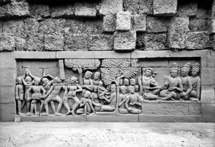 Keywords: COLLECTIE TROPENMUSEUM Reliëf O 52 op de verborgen voet van de Borobudur TMnr 10015790.jpg nl Negatief Negatief waarop reliëf O 52 van de verborgen voet van de Borobudur te zien is De verborgen voet van de Borobudur is de oorspronkelijke basis van het Buddhistische heiligdom dat rond 800 gebouwd is In een latere fase van de bouw werd deze basis verborgen waarschijnlijk om verzakking te verkomen De verborgen voet loopt om het hele bouwwerk heen en bevat 160 reliëfs die tezamen de Mahakarmawibhangga verbeelden een Mahayanistische tekst die de werking van de leer van Karma uiteenzet Deze leerrede wordt aan Buddha toegeschreven en handelt over oorzaak en gevolg N J Krom en Th van Erp duiden in hun standaardwerk over de Borobudur Beschrijving van Barabudur Den Haag Martinus Nijhoff 1920-1931 de reliëfs van de verborgen voet aan als serie O Op de reliëfs zijn voorbeelden van de theorie uitgebeeld goede daden hebben goede gevolgen en slechte daden hebben slechte gevolgen De reliëfs vallen in twee delen uiteen O 1 tot en met O 117 verbeelden een aantal daden die leiden tot één en hetzelfde gevolg De reliëfs O 118 tot en met O 160 tonen verschillende gevolgen van één oorzaak De uiteenzetting van de leer begint bij de trap aan de oostzijde en ontrolt zich met de klok mee om het bouwwerk heen De reliëfs moeten dan ook gelezen worden van rechts naar links Lange tijd was onbekend wat op de reliëfs van de verborgen voet stond afgebeeld Hoewel de reliëfs al in 1885 waren ontdekt door Dr Ir J W IJzerman 1851-1932 kon de Franse geleerde Sylvain Lévi pas in 1929 op het zesde Congres van het Oostersch Genootschap constateren dat het op de verborgen voet ging om een Buddhistische tekst Mahakarmawibhangga Lévi had in 1922 een manuscript uit 1411 met deze tekst ontdekt in Kathmandu Nepal De tekst bleek populair in de Burdhistische wereld te zijn en een aantal verwante teksten te hebben twee Chinese werken waarvan één vertaald was in 582 door Gautama Dharmaprajna en één tussen 980 en 1000 door T'ien si Tsai Daarnaast bevat de Tibetaanse Kanjur twee werken met de titel Karmawibhangga In 1933 publiceerde de archeoloog N J Krom een uitgebreide analyse van het Mahakarmawibhangga op de reliëfs van de bedolven voet Hierin legt hij een relatie tussen de afbeeldingen op de reliëfs en de tekstpassages in het Mahakarmawibhangga Reliëf O 52 bevindt zich aan de zuidzijde van de Borobudur en correspondeert volgens N J Krom met de negende paragraaf van het Mahakarmawibhangga Wat is de daad die een lage geboorte ten gevolge heeft Antwoord ongenaakbaarheid; inbeelding; het niet erkennen van vader en moeder; het niet handelen volgens sramana-regels; het niet handelen volgens brahmanen-regels; het te kort doen aan de eervied voor de oudste van het geslacht; het niet ten dienste staan van vader en moeder; het niet ten dienste staan van edele deugdzame lieden en het niet ten dienste staan van anderen die de plaats van guru vervullen leermeester en onderrichtgevers; het geringschatten van lieden van lage geboorte Dat is de daad die een lage geboorte ten gevolge heeft Uit N J Krom Het Karmawibhangga op Barabudur Mededeelingen der koninklijke academie van wetenschappen afdeeling letterkunde deel 76 serie B No 8 Amsterdam Noordhollandsche Uitgevers-Maatschappij 1933 227 Deze passage heeft betrekking op de reliëfs O 48 tot en met O 53 De asceten op O 52a zijn deugdzame lieden of degenen die als guru optreden Uit het reliëf blijkt niet in hoeverre zij gediend worden Bronnen A J Bernet Kempers Borobudur Mysteriegebeuren in steen Verval en restauratie Oudjavaans volksleven Wassenaar 1973/gewijzigde herdruk ; Van Erp Th Krom N J Beschrijving van Barabudur Den Haag Martinus Nijhoff 1920-1931 ; N J Krom Het Karmawibhangga op Barabudur Mededeelingen der koninklijke academie van wetenschappen afdeeling letterkunde deel 76 serie B No 8 Amsterdam Noordhollandsche Uitgevers-Maatschappij 1933 Reliëf O 52 op de verborgen voet van de Borobudur 1890-1891 institution Tropenmuseum KIT-source 10015790 Creator Kassian Cephas KIT-license PD-old-100 Photographs by Kassian Cephas Tropenmuseum Borobudur reliefs Borobudur in 1890 Black and white photographs |