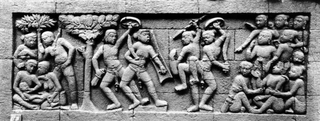 Keywords: COLLECTIE TROPENMUSEUM Reliëf O 5 op de verborgen voet van de Borobudur TMnr 10015743.jpg nl Repronegatief Negatief waarop reliëf O 5 van de verborgen voet van de Borobudur te zien is De verborgen voet van de Borobudur is de oorspronkelijke basis van het Buddhistische heiligdom dat rond 800 gebouwd is In een latere fase van de bouw werd deze basis verborgen waarschijnlijk om verzakking te verkomen De verborgen voet loopt om het hele bouwwerk heen en bevat 160 reliëfs die tezamen de Mahakarmawibhangga verbeelden een Mahayanistische tekst die de werking van de leer van Karma uiteenzet Deze leerrede wordt aan Buddha toegeschreven en handelt over oorzaak en gevolg N J Krom en Th van Erp duiden in hun standaardwerk over de Borobudur Beschrijving van Barabudur Den Haag Martinus Nijhoff 1920-1931 de reliëfs van de verborgen voet aan als serie O Op de reliëfs zijn voorbeelden van de theorie uitgebeeld goede daden hebben goede gevolgen en slechte daden hebben slechte gevolgen De reliëfs vallen in twee delen uiteen O 1 tot en met O 117 verbeelden een aantal daden die leiden tot één en hetzelfde gevolg De reliëfs O 118 tot en met O 160 tonen verschillende gevolgen van één oorzaak De uiteenzetting van de leer begint bij de trap aan de oostzijde en ontrolt zich met de klok mee om het bouwwerk heen De reliëfs moeten dan ook gelezen worden van rechts naar links Lange tijd was onbekend wat op de reliëfs van de verborgen voet stond afgebeeld Hoewel de reliëfs al in 1885 waren ontdekt door Dr Ir J W IJzerman 1851-1932 kon de Franse geleerde Sylvain Lévi pas in 1929 op het zesde Congres van het Oostersch Genootschap constateren dat het op de verborgen voet ging om een Buddhistische tekst Mahakarmawibhangga Lévi had in 1922 een manuscript uit 1411 met deze tekst ontdekt in Kathmandu Nepal De tekst bleek populair in de Burdhistische wereld te zijn en een aantal verwante teksten te hebben twee Chinese werken waarvan één vertaald was in 582 door Gautama Dharmaprajna en één tussen 980 en 1000 door T'ien si Tsai Daarnaast bevat de Tibetaanse Kanjur twee werken met de titel Karmawibhangga In 1933 publiceerde de archeoloog N J Krom een uitgebreide analyse van het Mahakarmawibhangga op de reliëfs van de bedolven voet Hierin legt hij een relatie tussen de afbeeldingen op de reliëfs en de tekstpassages in het Mahakarmawibhangga Reliëf O 5 bevindt zich aan de oostzijde van de Borobudur en correspondeert volgens N J Krom met de eerste paragraaf van het Mahakarmawibhangga Wat is dan de daad die een kort leven ten gevolge heeft Antwoord de aanslag op het leven; het zich verheugen over een aanslag op het leven het prijzen van een aanslag op het leven; het genoegen scheppen in de dood van een vijand; het aanzetten tot de dood van een vijand; het prijzen van de dood van een vijand; de vruchtafdrijving; het prijzen van de vruchtafdrijving; het inrichten van een terrein waar veel levende wezens gedood worden buffels vee varkens hanen enz terwijl van de brenger van het offer de kinderen en kindskinderen en andere mensen uit winstbejag en vrees hem navolgend levende wezens doden Zoals een bedelmonnik in de grote stad Kasmira Uit N J Krom Het Karmawibhangga op Barabudur Mededeelingen der koninklijke academie van wetenschappen afdeeling letterkunde deel 76 serie B No 8 Amsterdam Noordhollandsche Uitgevers-Maatschappij 1933 218 Op reliëf O 5 staan op het rechtergedeelte een groep toeschouwers en een groep gewapende mannen tegenover elkaar het bekijken van een gevecht en genoegen hebben in het zien van dodende wapens Op 5b het linkertafereel is het korte leven verbeeld door een stervend kind Bronnen A J Bernet Kempers Borobudur Mysteriegebeuren in steen Verval en restauratie Oudjavaans volksleven Wassenaar 1973/gewijzigde herdruk ; Van Erp Th Krom N J Beschrijving van Barabudur Den Haag Martinus Nijhoff 1920-1931 ; N J Krom Het Karmawibhangga op Barabudur Mededeelingen der koninklijke academie van wetenschappen afdeeling letterkunde deel 76 serie B No 8 Amsterdam Noordhollandsche Uitgevers-Maatschappij 1933 Reliëf O 5 op de verborgen voet van de Borobudur 1890-1891 institution Tropenmuseum KIT-source 10015743 Creator Kassian Cephas KIT-license PD-old-100 Photographs by Kassian Cephas Tropenmuseum Borobudur reliefs Borobudur in 1890 Black and white photographs |
