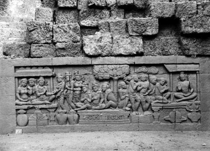 | Keywords: COLLECTIE TROPENMUSEUM Reliëf O 66 op de verborgen voet van de Borobudur TMnr 10015804.jpg nl Negatief Negatief waarop reliëf O 66 van de verborgen voet van de Borobudur te zien is De verborgen voet van de Borobudur is de oorspronkelijke basis van het Buddhistische heiligdom dat rond 800 gebouwd is In een latere fase van de bouw werd deze basis verborgen waarschijnlijk om verzakking te verkomen De verborgen voet loopt om het hele bouwwerk heen en bevat 160 reliëfs die tezamen de Mahakarmawibhangga verbeelden een Mahayanistische tekst die de werking van de leer van Karma uiteenzet Deze leerrede wordt aan Buddha toegeschreven en handelt over oorzaak en gevolg N J Krom en Th van Erp duiden in hun standaardwerk over de Borobudur Beschrijving van Barabudur Den Haag Martinus Nijhoff 1920-1931 de reliëfs van de verborgen voet aan als serie O Op de reliëfs zijn voorbeelden van de theorie uitgebeeld goede daden hebben goede gevolgen en slechte daden hebben slechte gevolgen De reliëfs vallen in twee delen uiteen O 1 tot en met O 117 verbeelden een aantal daden die leiden tot één en hetzelfde gevolg De reliëfs O 118 tot en met O 160 tonen verschillende gevolgen van één oorzaak De uiteenzetting van de leer begint bij de trap aan de oostzijde en ontrolt zich met de klok mee om het bouwwerk heen De reliëfs moeten dan ook gelezen worden van rechts naar links Lange tijd was onbekend wat op de reliëfs van de verborgen voet stond afgebeeld Hoewel de reliëfs al in 1885 waren ontdekt door Dr Ir J W IJzerman 1851-1932 kon de Franse geleerde Sylvain Lévi pas in 1929 op het zesde Congres van het Oostersch Genootschap constateren dat het op de verborgen voet ging om een Buddhistische tekst Mahakarmawibhangga Lévi had in 1922 een manuscript uit 1411 met deze tekst ontdekt in Kathmandu Nepal De tekst bleek populair in de Burdhistische wereld te zijn en een aantal verwante teksten te hebben twee Chinese werken waarvan één vertaald was in 582 door Gautama Dharmaprajna en één tussen 980 en 1000 door T'ien si Tsai Daarnaast bevat de Tibetaanse Kanjur twee werken met de titel Karmawibhangga In 1933 publiceerde de archeoloog N J Krom een uitgebreide analyse van het Mahakarmawibhangga op de reliëfs van de bedolven voet Hierin legt hij een relatie tussen de afbeeldingen op de reliëfs en de tekstpassages in het Mahakarmawibhangga Reliëf O 66 bevindt zich aan de westzijde van de Borobudur en correspondeert volgens N J Krom met de twaalfde paragraaf van het Mahakarmawibhangga Wat is de daad die een groot bezit ten gevolge heeft Antwoord het afzien van het nemen van wat niet gegeven is; het anderen afhouden van het nemen van wat niet gegeven is; het zich erover verheugen wanneer anderen ervan afzien te nemen wat niet gegeven is; het schenken van levensonderhoud aan vader en moeder; het schenken van levensonderhoud aan edele deugdzame lieden; desgelijks het schenken van levensonderhoud aan anderen zieken kinderen grijsaards en ellendigen; tevredenheid met het voordeel van een ander; ontevredenheid wanneer een ander geen voordeel heeft; het zich zeer verheugen in andermans voordeel; het genoegen scheppen in een goede oogst Zo ook Dat is de daad die een groot bezit ten gevolge heeft Uit N J Krom Het Karmawibhangga op Barabudur Mededeelingen der koninklijke academie van wetenschappen afdeeling letterkunde deel 76 serie B No 8 Amsterdam Noordhollandsche Uitgevers-Maatschappij 1933 231 Deze passage heeft betrekking op de reliëfs O 66 tot en met O 73 Deze reliëfs tonen een aantal personen die getuige zijn van een uitdeling Pp het linkertafereel zijn rijke personen afgebeeld; er staan opgestapelde schatten afgebeeld en de personen bevinden zich in een aanzienlijke omgeving Op deze reliëfs is de goede oogst uit de tekst achterwege gelaten Op reliëf O 66a legt een man iets uit Bronnen A J Bernet Kempers Borobudur Mysteriegebeuren in steen Verval en restauratie Oudjavaans volksleven Wassenaar 1973/gewijzigde herdruk ; Van Erp Th Krom N J Beschrijving van Barabudur Den Haag Martinus Nijhoff 1920-1931 ; N J Krom Het Karmawibhangga op Barabudur Mededeelingen der koninklijke academie van wetenschappen afdeeling letterkunde deel 76 serie B No 8 Amsterdam Noordhollandsche Uitgevers-Maatschappij 1933 Reliëf O 66 op de verborgen voet van de Borobudur 1890-1891 institution Tropenmuseum KIT-source 10015804 Creator Kassian Cephas KIT-license PD-old-100 Photographs by Kassian Cephas Tropenmuseum Borobudur reliefs Borobudur in 1890 Black and white photographs |