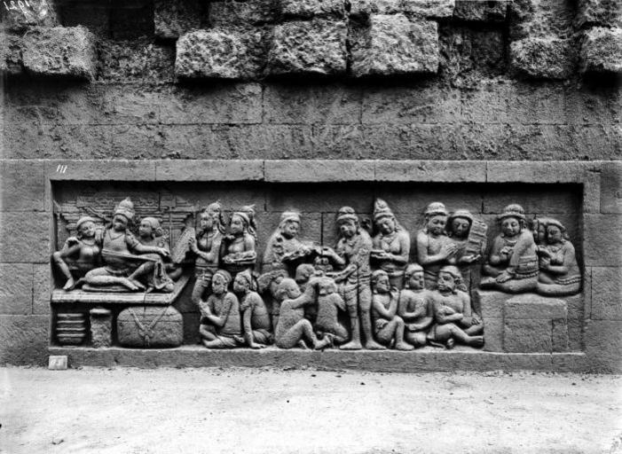 Keywords: COLLECTIE TROPENMUSEUM Reliëf O 70 op de verborgen voet van de Borobudur TMnr 10015807.jpg nl Negatief Negatief waarop reliëf O 70 van de verborgen voet van de Borobudur te zien is De verborgen voet van de Borobudur is de oorspronkelijke basis van het Buddhistische heiligdom dat rond 800 gebouwd is In een latere fase van de bouw werd deze basis verborgen waarschijnlijk om verzakking te verkomen De verborgen voet loopt om het hele bouwwerk heen en bevat 160 reliëfs die tezamen de Mahakarmawibhangga verbeelden een Mahayanistische tekst die de werking van de leer van Karma uiteenzet Deze leerrede wordt aan Buddha toegeschreven en handelt over oorzaak en gevolg N J Krom en Th van Erp duiden in hun standaardwerk over de Borobudur Beschrijving van Barabudur Den Haag Martinus Nijhoff 1920-1931 de reliëfs van de verborgen voet aan als serie O Op de reliëfs zijn voorbeelden van de theorie uitgebeeld goede daden hebben goede gevolgen en slechte daden hebben slechte gevolgen De reliëfs vallen in twee delen uiteen O 1 tot en met O 117 verbeelden een aantal daden die leiden tot één en hetzelfde gevolg De reliëfs O 118 tot en met O 160 tonen verschillende gevolgen van één oorzaak De uiteenzetting van de leer begint bij de trap aan de oostzijde en ontrolt zich met de klok mee om het bouwwerk heen De reliëfs moeten dan ook gelezen worden van rechts naar links Lange tijd was onbekend wat op de reliëfs van de verborgen voet stond afgebeeld Hoewel de reliëfs al in 1885 waren ontdekt door Dr Ir J W IJzerman 1851-1932 kon de Franse geleerde Sylvain Lévi pas in 1929 op het zesde Congres van het Oostersch Genootschap constateren dat het op de verborgen voet ging om een Buddhistische tekst Mahakarmawibhangga Lévi had in 1922 een manuscript uit 1411 met deze tekst ontdekt in Kathmandu Nepal De tekst bleek populair in de Burdhistische wereld te zijn en een aantal verwante teksten te hebben twee Chinese werken waarvan één vertaald was in 582 door Gautama Dharmaprajna en één tussen 980 en 1000 door T'ien si Tsai Daarnaast bevat de Tibetaanse Kanjur twee werken met de titel Karmawibhangga In 1933 publiceerde de archeoloog N J Krom een uitgebreide analyse van het Mahakarmawibhangga op de reliëfs van de bedolven voet Hierin legt hij een relatie tussen de afbeeldingen op de reliëfs en de tekstpassages in het Mahakarmawibhangga Reliëf O 70 bevindt zich aan de westzijde van de Borobudur en correspondeert volgens N J Krom met de twaalfde paragraaf van het Mahakarmawibhangga Wat is de daad die een groot bezit ten gevolge heeft Antwoord het afzien van het nemen van wat niet gegeven is; het anderen afhouden van het nemen van wat niet gegeven is; het zich erover verheugen wanneer anderen ervan afzien te nemen wat niet gegeven is; het schenken van levensonderhoud aan vader en moeder; het schenken van levensonderhoud aan edele deugdzame lieden; desgelijks het schenken van levensonderhoud aan anderen zieken kinderen grijsaards en ellendigen; tevredenheid met het voordeel van een ander; ontevredenheid wanneer een ander geen voordeel heeft; het zich zeer verheugen in andermans voordeel; het genoegen scheppen in een goede oogst Zo ook Dat is de daad die een groot bezit ten gevolge heeft Uit N J Krom Het Karmawibhangga op Barabudur Mededeelingen der koninklijke academie van wetenschappen afdeeling letterkunde deel 76 serie B No 8 Amsterdam Noordhollandsche Uitgevers-Maatschappij 1933 231 Deze passage heeft betrekking op de reliëfs O 66 tot en met O 73 Deze reliëfs tonen een aantal personen die getuige zijn van een uitdeling Pp het linkertafereel zijn rijke personen afgebeeld; er staan opgestapelde schatten afgebeeld en de personen bevinden zich in een aanzienlijke omgeving Op deze reliëfs is de goede oogst uit de tekst achterwege gelaten Op reliëf O 70a staan de kinderen uit de tekst afgebeeld Bronnen A J Bernet Kempers Borobudur Mysteriegebeuren in steen Verval en restauratie Oudjavaans volksleven Wassenaar 1973/gewijzigde herdruk ; Van Erp Th Krom N J Beschrijving van Barabudur Den Haag Martinus Nijhoff 1920-1931 ; N J Krom Het Karmawibhangga op Barabudur Mededeelingen der koninklijke academie van wetenschappen afdeeling letterkunde deel 76 serie B No 8 Amsterdam Noordhollandsche Uitgevers-Maatschappij 1933 Reliëf O 70 op de verborgen voet van de Borobudur 1890-1891 institution Tropenmuseum KIT-source 10015807 Creator Kassian Cephas KIT-license PD-old-100 Tropenmuseum Borobudur reliefs Photographs by Kassian Cephas Borobudur in 1890 Black and white photographs |