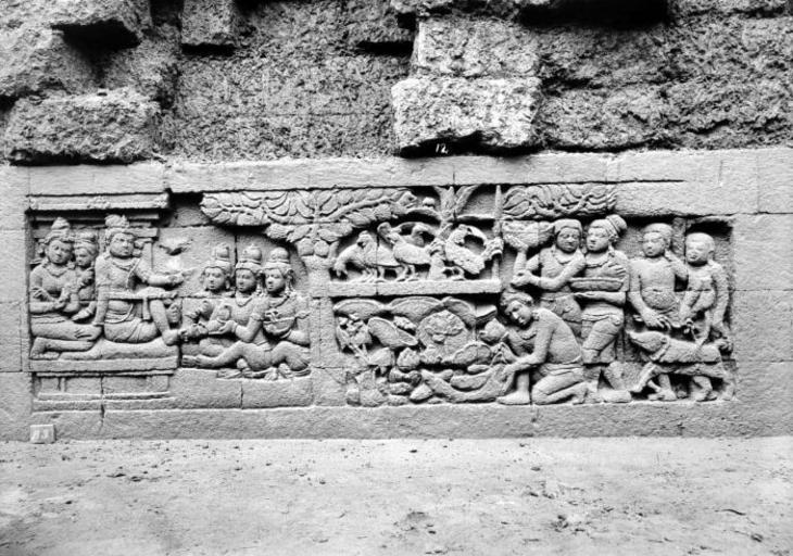 Keywords: COLLECTIE TROPENMUSEUM Reliëf O 9 op de verborgen voet van de Borobudur TMnr 10015747.jpg nl Negatief Negatief waarop reliëf O 9 van de verborgen voet van de Borobudur te zien is De verborgen voet van de Borobudur is de oorspronkelijke basis van het Buddhistische heiligdom dat rond 800 gebouwd is In een latere fase van de bouw werd deze basis verborgen waarschijnlijk om verzakking te verkomen De verborgen voet loopt om het hele bouwwerk heen en bevat 160 reliëfs die tezamen de Mahakarmawibhangga verbeelden een Mahayanistische tekst die de werking van de leer van Karma uiteenzet Deze leerrede wordt aan Buddha toegeschreven en handelt over oorzaak en gevolg N J Krom en Th van Erp duiden in hun standaardwerk over de Borobudur Beschrijving van Barabudur Den Haag Martinus Nijhoff 1920-1931 de reliëfs van de verborgen voet aan als serie O Op de reliëfs zijn voorbeelden van de theorie uitgebeeld goede daden hebben goede gevolgen en slechte daden hebben slechte gevolgen De reliëfs vallen in twee delen uiteen O 1 tot en met O 117 verbeelden een aantal daden die leiden tot één en hetzelfde gevolg De reliëfs O 118 tot en met O 160 tonen verschillende gevolgen van één oorzaak De uiteenzetting van de leer begint bij de trap aan de oostzijde en ontrolt zich met de klok mee om het bouwwerk heen De reliëfs moeten dan ook gelezen worden van rechts naar links Lange tijd was onbekend wat op de reliëfs van de verborgen voet stond afgebeeld Hoewel de reliëfs al in 1885 waren ontdekt door Dr Ir J W IJzerman 1851-1932 kon de Franse geleerde Sylvain Lévi pas in 1929 op het zesde Congres van het Oostersch Genootschap constateren dat het op de verborgen voet ging om een Buddhistische tekst Mahakarmawibhangga Lévi had in 1922 een manuscript uit 1411 met deze tekst ontdekt in Kathmandu Nepal De tekst bleek populair in de Burdhistische wereld te zijn en een aantal verwante teksten te hebben twee Chinese werken waarvan één vertaald was in 582 door Gautama Dharmaprajna en één tussen 980 en 1000 door T'ien si Tsai Daarnaast bevat de Tibetaanse Kanjur twee werken met de titel Karmawibhangga In 1933 publiceerde de archeoloog N J Krom een uitgebreide analyse van het Mahakarmawibhangga op de reliëfs van de bedolven voet Hierin legt hij een relatie tussen de afbeeldingen op de reliëfs en de tekstpassages in het Mahakarmawibhangga Reliëf O 9 bevindt zich aan de oostzijde van de Borobudur en correspondeert volgens N J Krom met de tweede paragraaf van het Mahakarmawibhangga Wat is dan de daad die een lang leven ten gevolge heeft Antwoord het afzien van de aanslag op het leven; het prijzen van het afzien van de aanslag van het leven; het aanzetten daartoe; het prijzen daarvan; het vrijlaten van wezens die ter dood gedoemd zijn mensen vee varkens hanen enz ; het geven van veiligheid aan wezens in angst; de gedachte van mededogen temidden van verlaten wezens; de gedachte van welwillendheid temidden van uitgeputte wezens en ook van anderen kinderen en grijsaards; ook het geven van voedsel aan hen; de gedachte van welwillendheid voor degenen die de gave ontvangen Hetgeen hiervoor gezegd is van het aanschouwen van strijd enz in goede zin; ook het herstellen van vervallen stupa's caitya's en kloosters Dat is de daad die een lang leven ten gevolge heeft Uit N J Krom Het Karmawibhangga op Barabudur Mededeelingen der koninklijke academie van wetenschappen afdeeling letterkunde deel 76 serie B No 8 Amsterdam Noordhollandsche Uitgevers-Maatschappij 1933 220 Op reliëf O 9a is de vrijlating van dieren te zien Afgebeeld zijn varkens en hanen zoals die in de tekst genoemd worden Op het linkergedeelte is een aanzienlijke man te zien met zijn gezin en dienaren Dit is een manier om het lange leven uit te beelden Aan de rechterkant worden de goede daden getoond die daartoe hebben geleid De reliëfs O 6 tot en met O 12 laten de welwillendheid zien tegenover mensen die geschenken ontvangen Er is niets afgebeeld over het bekijken van een gevecht of het herstellen van heiligdommen uit de laatste zin van de tekst Bronnen A J Bernet Kempers Borobudur Mysteriegebeuren in steen Verval en restauratie Oudjavaans volksleven Wassenaar 1973/gewijzigde herdruk ; Van Erp Th Krom N J Beschrijving van Barabudur Den Haag Martinus Nijhoff 1920-1931 ; N J Krom Het Karmawibhangga op Barabudur Mededeelingen der koninklijke academie van wetenschappen afdeeling letterkunde deel 76 serie B No 8 Amsterdam Noordhollandsche Uitgevers-Maatschappij 1933 Reliëf O 9 op de verborgen voet van de Borobudur 1890-1891 institution Tropenmuseum KIT-source 10015747 Creator Kassian Cephas Borobudur in 1890 Black and white photographs |