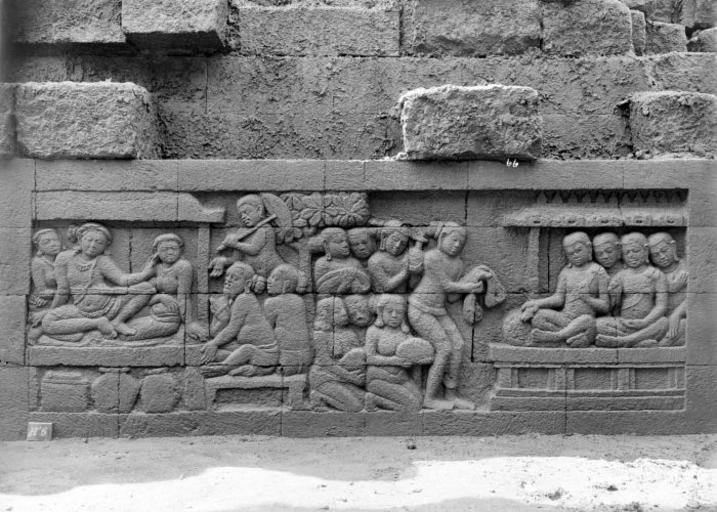 Keywords: COLLECTIE TROPENMUSEUM Reliëf O 115 op de verborgen voet van de Borobudur TMnr 10015852.jpg nl Negatief Negatief waarop reliëf O 115 van de verborgen voet van de Borobudur te zien is De verborgen voet van de Borobudur is de oorspronkelijke basis van het Buddhistische heiligdom dat rond 800 gebouwd is In een latere fase van de bouw werd deze basis verborgen waarschijnlijk om verzakking te verkomen De verborgen voet loopt om het hele bouwwerk heen en bevat 160 reliëfs die tezamen de Mahakarmawibhangga verbeelden een Mahayanistische tekst die de werking van de leer van Karma uiteenzet Deze leerrede wordt aan Buddha toegeschreven en handelt over oorzaak en gevolg N J Krom en Th van Erp duiden in hun standaardwerk over de Borobudur Beschrijving van Barabudur Den Haag Martinus Nijhoff 1920-1931 de reliëfs van de verborgen voet aan als serie O Op de reliëfs zijn voorbeelden van de theorie uitgebeeld goede daden hebben goede gevolgen en slechte daden hebben slechte gevolgen De reliëfs vallen in twee delen uiteen O 1 tot en met O 117 verbeelden een aantal daden die leiden tot één en hetzelfde gevolg De reliëfs O 118 tot en met O 160 tonen verschillende gevolgen van één oorzaak De uiteenzetting van de leer begint bij de trap aan de oostzijde en ontrolt zich met de klok mee om het bouwwerk heen De reliëfs moeten dan ook gelezen worden van rechts naar links Lange tijd was onbekend wat op de reliëfs van de verborgen voet stond afgebeeld Hoewel de reliëfs al in 1885 waren ontdekt door Dr Ir J W IJzerman 1851-1932 kon de Franse geleerde Sylvain Lévi pas in 1929 op het zesde Congres van het Oostersch Genootschap constateren dat het op de verborgen voet ging om een Buddhistische tekst Mahakarmawibhangga Lévi had in 1922 een manuscript uit 1411 met deze tekst ontdekt in Kathmandu Nepal De tekst bleek populair in de Burdhistische wereld te zijn en een aantal verwante teksten te hebben twee Chinese werken waarvan één vertaald was in 582 door Gautama Dharmaprajna en één tussen 980 en 1000 door T'ien si Tsai Daarnaast bevat de Tibetaanse Kanjur twee werken met de titel Karmawibhangga In 1933 publiceerde de archeoloog N J Krom een uitgebreide analyse van het Mahakarmawibhangga op de reliëfs van de bedolven voet Hierin legt hij een relatie tussen de afbeeldingen op de reliëfs en de tekstpassages in het Mahakarmawibhangga Reliëf O 115 bevindt zich aan de noordzijde van de Borobudur N J Krom verbindt de paragrafen 37 38 38a en 39 van het Mahakarmawibhangga aan de reliëfs O 115 tot en met O 117 hoewel het moeilijk is deze reliëfs expliet aan één van deze paragrafen te verbinden XXXVII Wat is de daad waardoor het individu dat eraan verbonden is rijk en gierig wordt Antwoord door iemand hier wordt slechts een geringe gave gegeven aan een deugdzaam mens waardig die te ontvangen; zijn vrijgevige gezindheid herhaalt zich niet en hernieuwt zich niet Als deze onder de mensen geboren wordt wordt hij in grote rijke gefortuneerde geslachten geboren door de voortreffelijkheid van zijn gave maar omdat zijn vrijgevige gezindheid zich niet herhaald en zich niet hernieuwd heeft wordt hij gierig Zoals Dat individu wordt rijk en gierig XXXVIII Wat is de daad waardoor het individu dat eraan verbonden is arm en vrijgevig wordt Antwoord door een individu hier zijn veel gaven geschonken aan dieren en mensen van slecht gedrag zonder brahmaanse levenswandel; herhaaldelijk hernieuwt zich zijn vrijgevige gezindheid Als deze onder de mensen geboren wordt is hij arm en vrijgevig door die hernieuwde gaven maar omdat zijn gaven aan lieden gegeven zijn die het niet waard zijn ze te ontvangen is hij arm Zoals Dat is de daad waardoor het individu dat eraan verbonden is arm en vrijgevig wordt XXXVIIIa Wat is de daad waardoor het individu dat eraan verbonden is arm en gierig wordt Antwoord door een individu hier wordt niets gegeven aan deugdzame mensen en vrijgevige gezindheid is niet aanwezig Als deze onder de mensen geboren wordt is het in arme geslachten en omdat hij geen vrijgevige gezindheid had wordt hij gierig XXXIX Wat is de daad waardoor het individu dat eraan verbonden is rijk en vrijgevig wordt Antwoord door een individu hier zijn veel gaven geschonken aan deugdzame mensen die het waard zijn ze te ontvangen; deze vrijgevigheid herhaalt zich herhaaldelijk Als deze onder de mensen geboren wordt wordt hij door die daad in grote rijke gefortuneerde geslachten geboren en omdat herhaaldelijk zijn vrijgevige gezindheid zich heeft hernieuwd wordt hij vrijgevig Zoals Dat is de daad waardoor het individu dat eraan verbonden is rijk en vrijgevig wordt Op de reliëfs is het volgende te zien Op O 115a zien wij het schenken van kleding en andere zaken aan een aantal figuren in een paviljoen die op monniken lijken maar een ongewoon brede overslag langs het lichaam dragen Op O 115b is het gevolg afgebeeld een man in een paviljoen die niet de kleding van de hele aanzienlijken draagt maar toch iemand van welstand is te oordelen aan de versierselen potten en de kist met rijkdommen Hij maakt een afwerend gebaar tegen twee brahmanen tegenover hem van wie één de hand ophoudt Op reliëf O 116a zien wij een monnik geschenken krijgen Op O 116b krijgt een brahmaan giften O 116c toont een rijke man die aan het uitdelen is De hoofdpersoon op O 117 maakt een duidelijke afwijzing tegen de smekelingen brahmanen en anderen Een dienaar weert deze ook af Op O 117b zijn een arme grassnijder en een vrouw met haar rug tegen hem aan afgebeeld Zij weert een kind af dat bij een paar straatmuzikanten schijnt te horen De grassnijder kijkt de andere kant op Krom meent dat over reliëf O 116 geen twijfel mogelijk is; hier is een herhaalde schenking te zien aan waardige personen Het gevolg daarvan is een weldadige rijke Dit reliëf hoort bij paragraaf XXXIX van het Karmawibhangga O 117 schijnt het geval te zijn van arm en gierig dat niet in de tekst voorkomt; het gevolg van het niet schenken aan wie daarvoor in aanmerking komen Uit N J Krom H