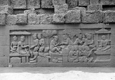 Keywords: COLLECTIE TROPENMUSEUM Reliëf O 116 op de verborgen voet van de Borobudur TMnr 10015853.jpg nl Negatief Negatief waarop reliëf O 116 van de verborgen voet van de Borobudur te zien is De verborgen voet van de Borobudur is de oorspronkelijke basis van het Buddhistische heiligdom dat rond 800 gebouwd is In een latere fase van de bouw werd deze basis verborgen waarschijnlijk om verzakking te verkomen De verborgen voet loopt om het hele bouwwerk heen en bevat 160 reliëfs die tezamen de Mahakarmawibhangga verbeelden een Mahayanistische tekst die de werking van de leer van Karma uiteenzet Deze leerrede wordt aan Buddha toegeschreven en handelt over oorzaak en gevolg N J Krom en Th van Erp duiden in hun standaardwerk over de Borobudur Beschrijving van Barabudur Den Haag Martinus Nijhoff 1920-1931 de reliëfs van de verborgen voet aan als serie O Op de reliëfs zijn voorbeelden van de theorie uitgebeeld goede daden hebben goede gevolgen en slechte daden hebben slechte gevolgen De reliëfs vallen in twee delen uiteen O 1 tot en met O 117 verbeelden een aantal daden die leiden tot één en hetzelfde gevolg De reliëfs O 118 tot en met O 160 tonen verschillende gevolgen van één oorzaak De uiteenzetting van de leer begint bij de trap aan de oostzijde en ontrolt zich met de klok mee om het bouwwerk heen De reliëfs moeten dan ook gelezen worden van rechts naar links Lange tijd was onbekend wat op de reliëfs van de verborgen voet stond afgebeeld Hoewel de reliëfs al in 1885 waren ontdekt door Dr Ir J W IJzerman 1851-1932 kon de Franse geleerde Sylvain Lévi pas in 1929 op het zesde Congres van het Oostersch Genootschap constateren dat het op de verborgen voet ging om een Buddhistische tekst Mahakarmawibhangga Lévi had in 1922 een manuscript uit 1411 met deze tekst ontdekt in Kathmandu Nepal De tekst bleek populair in de Burdhistische wereld te zijn en een aantal verwante teksten te hebben twee Chinese werken waarvan één vertaald was in 582 door Gautama Dharmaprajna en één tussen 980 en 1000 door T'ien si Tsai Daarnaast bevat de Tibetaanse Kanjur twee werken met de titel Karmawibhangga In 1933 publiceerde de archeoloog N J Krom een uitgebreide analyse van het Mahakarmawibhangga op de reliëfs van de bedolven voet Hierin legt hij een relatie tussen de afbeeldingen op de reliëfs en de tekstpassages in het Mahakarmawibhangga Reliëf O 116 bevindt zich aan de noordzijde van de Borobudur N J Krom verbindt de paragrafen 37 38 38a en 39 van het Mahakarmawibhangga aan de reliëfs O 115 tot en met O 117 hoewel het moeilijk is deze reliëfs expliet aan één van deze paragrafen te verbinden XXXVII Wat is de daad waardoor het individu dat eraan verbonden is rijk en gierig wordt Antwoord door iemand hier wordt slechts een geringe gave gegeven aan een deugdzaam mens waardig die te ontvangen; zijn vrijgevige gezindheid herhaalt zich niet en hernieuwt zich niet Als deze onder de mensen geboren wordt wordt hij in grote rijke gefortuneerde geslachten geboren door de voortreffelijkheid van zijn gave maar omdat zijn vrijgevige gezindheid zich niet herhaald en zich niet hernieuwd heeft wordt hij gierig Zoals Dat individu wordt rijk en gierig XXXVIII Wat is de daad waardoor het individu dat eraan verbonden is arm en vrijgevig wordt Antwoord door een individu hier zijn veel gaven geschonken aan dieren en mensen van slecht gedrag zonder brahmaanse levenswandel; herhaaldelijk hernieuwt zich zijn vrijgevige gezindheid Als deze onder de mensen geboren wordt is hij arm en vrijgevig door die hernieuwde gaven maar omdat zijn gaven aan lieden gegeven zijn die het niet waard zijn ze te ontvangen is hij arm Zoals Dat is de daad waardoor het individu dat eraan verbonden is arm en vrijgevig wordt XXXVIIIa Wat is de daad waardoor het individu dat eraan verbonden is arm en gierig wordt Antwoord door een individu hier wordt niets gegeven aan deugdzame mensen en vrijgevige gezindheid is niet aanwezig Als deze onder de mensen geboren wordt is het in arme geslachten en omdat hij geen vrijgevige gezindheid had wordt hij gierig XXXIX Wat is de daad waardoor het individu dat eraan verbonden is rijk en vrijgevig wordt Antwoord door een individu hier zijn veel gaven geschonken aan deugdzame mensen die het waard zijn ze te ontvangen; deze vrijgevigheid herhaalt zich herhaaldelijk Als deze onder de mensen geboren wordt wordt hij door die daad in grote rijke gefortuneerde geslachten geboren en omdat herhaaldelijk zijn vrijgevige gezindheid zich heeft hernieuwd wordt hij vrijgevig Zoals Dat is de daad waardoor het individu dat eraan verbonden is rijk en vrijgevig wordt Op de reliëfs is het volgende te zien Op O 115a zien wij het schenken van kleding en andere zaken aan een aantal figuren in een paviljoen die op monniken lijken maar een ongewoon brede overslag langs het lichaam dragen Op O 115b is het gevolg afgebeeld een man in een paviljoen die niet de kleding van de hele aanzienlijken draagt maar toch iemand van welstand is te oordelen aan de versierselen potten en de kist met rijkdommen Hij maakt een afwerend gebaar tegen twee brahmanen tegenover hem van wie één de hand ophoudt Op reliëf O 116a zien wij een monnik geschenken krijgen Op O 116b krijgt een brahmaan giften O 116c toont een rijke man die aan het uitdelen is De hoofdpersoon op O 117 maakt een duidelijke afwijzing tegen de smekelingen brahmanen en anderen Een dienaar weert deze ook af Op O 117b zijn een arme grassnijder en een vrouw met haar rug tegen hem aan afgebeeld Zij weert een kind af dat bij een paar straatmuzikanten schijnt te horen De grassnijder kijkt de andere kant op Krom meent dat over reliëf O 116 geen twijfel mogelijk is; hier is een herhaalde schenking te zien aan waardige personen Het gevolg daarvan is een weldadige rijke Dit reliëf hoort bij paragraaf XXXIX van het Karmawibhangga O 117 schijnt het geval te zijn van arm en gierig dat niet in de tekst voorkomt; het gevolg van het niet schenken aan wie daarvoor in aanmerking komen Uit N J Krom H