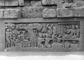 Keywords: COLLECTIE TROPENMUSEUM Reliëf O 117 op de verborgen voet van de Borobudur TMnr 10015854.jpg nl Negatief Negatief waarop reliëf O 117 van de verborgen voet van de Borobudur te zien is De verborgen voet van de Borobudur is de oorspronkelijke basis van het Buddhistische heiligdom dat rond 800 gebouwd is In een latere fase van de bouw werd deze basis verborgen waarschijnlijk om verzakking te verkomen De verborgen voet loopt om het hele bouwwerk heen en bevat 160 reliëfs die tezamen de Mahakarmawibhangga verbeelden een Mahayanistische tekst die de werking van de leer van Karma uiteenzet Deze leerrede wordt aan Buddha toegeschreven en handelt over oorzaak en gevolg N J Krom en Th van Erp duiden in hun standaardwerk over de Borobudur Beschrijving van Barabudur Den Haag Martinus Nijhoff 1920-1931 de reliëfs van de verborgen voet aan als serie O Op de reliëfs zijn voorbeelden van de theorie uitgebeeld goede daden hebben goede gevolgen en slechte daden hebben slechte gevolgen De reliëfs vallen in twee delen uiteen O 1 tot en met O 117 verbeelden een aantal daden die leiden tot één en hetzelfde gevolg De reliëfs O 118 tot en met O 160 tonen verschillende gevolgen van één oorzaak De uiteenzetting van de leer begint bij de trap aan de oostzijde en ontrolt zich met de klok mee om het bouwwerk heen De reliëfs moeten dan ook gelezen worden van rechts naar links Lange tijd was onbekend wat op de reliëfs van de verborgen voet stond afgebeeld Hoewel de reliëfs al in 1885 waren ontdekt door Dr Ir J W IJzerman 1851-1932 kon de Franse geleerde Sylvain Lévi pas in 1929 op het zesde Congres van het Oostersch Genootschap constateren dat het op de verborgen voet ging om een Buddhistische tekst Mahakarmawibhangga Lévi had in 1922 een manuscript uit 1411 met deze tekst ontdekt in Kathmandu Nepal De tekst bleek populair in de Burdhistische wereld te zijn en een aantal verwante teksten te hebben twee Chinese werken waarvan één vertaald was in 582 door Gautama Dharmaprajna en één tussen 980 en 1000 door T'ien si Tsai Daarnaast bevat de Tibetaanse Kanjur twee werken met de titel Karmawibhangga In 1933 publiceerde de archeoloog N J Krom een uitgebreide analyse van het Mahakarmawibhangga op de reliëfs van de bedolven voet Hierin legt hij een relatie tussen de afbeeldingen op de reliëfs en de tekstpassages in het Mahakarmawibhangga Reliëf O 117 bevindt zich aan de noordzijde van de Borobudur N J Krom verbindt de paragrafen 37 38 38a en 39 van het Mahakarmawibhangga aan de reliëfs O 115 tot en met O 117 hoewel het moeilijk is deze reliëfs expliet aan één van deze paragrafen te verbinden XXXVII Wat is de daad waardoor het individu dat eraan verbonden is rijk en gierig wordt Antwoord door iemand hier wordt slechts een geringe gave gegeven aan een deugdzaam mens waardig die te ontvangen; zijn vrijgevige gezindheid herhaalt zich niet en hernieuwt zich niet Als deze onder de mensen geboren wordt wordt hij in grote rijke gefortuneerde geslachten geboren door de voortreffelijkheid van zijn gave maar omdat zijn vrijgevige gezindheid zich niet herhaald en zich niet hernieuwd heeft wordt hij gierig Zoals Dat individu wordt rijk en gierig XXXVIII Wat is de daad waardoor het individu dat eraan verbonden is arm en vrijgevig wordt Antwoord door een individu hier zijn veel gaven geschonken aan dieren en mensen van slecht gedrag zonder brahmaanse levenswandel; herhaaldelijk hernieuwt zich zijn vrijgevige gezindheid Als deze onder de mensen geboren wordt is hij arm en vrijgevig door die hernieuwde gaven maar omdat zijn gaven aan lieden gegeven zijn die het niet waard zijn ze te ontvangen is hij arm Zoals Dat is de daad waardoor het individu dat eraan verbonden is arm en vrijgevig wordt XXXVIIIa Wat is de daad waardoor het individu dat eraan verbonden is arm en gierig wordt Antwoord door een individu hier wordt niets gegeven aan deugdzame mensen en vrijgevige gezindheid is niet aanwezig Als deze onder de mensen geboren wordt is het in arme geslachten en omdat hij geen vrijgevige gezindheid had wordt hij gierig XXXIX Wat is de daad waardoor het individu dat eraan verbonden is rijk en vrijgevig wordt Antwoord door een individu hier zijn veel gaven geschonken aan deugdzame mensen die het waard zijn ze te ontvangen; deze vrijgevigheid herhaalt zich herhaaldelijk Als deze onder de mensen geboren wordt wordt hij door die daad in grote rijke gefortuneerde geslachten geboren en omdat herhaaldelijk zijn vrijgevige gezindheid zich heeft hernieuwd wordt hij vrijgevig Zoals Dat is de daad waardoor het individu dat eraan verbonden is rijk en vrijgevig wordt Op de reliëfs is het volgende te zien Op O 115a zien wij het schenken van kleding en andere zaken aan een aantal figuren in een paviljoen die op monniken lijken maar een ongewoon brede overslag langs het lichaam dragen Op O 115b is het gevolg afgebeeld een man in een paviljoen die niet de kleding van de hele aanzienlijken draagt maar toch iemand van welstand is te oordelen aan de versierselen potten en de kist met rijkdommen Hij maakt een afwerend gebaar tegen twee brahmanen tegenover hem van wie één de hand ophoudt Op reliëf O 116a zien wij een monnik geschenken krijgen Op O 116b krijgt een brahmaan giften O 116c toont een rijke man die aan het uitdelen is De hoofdpersoon op O 117 maakt een duidelijke afwijzing tegen de smekelingen brahmanen en anderen Een dienaar weert deze ook af Op O 117b zijn een arme grassnijder en een vrouw met haar rug tegen hem aan afgebeeld Zij weert een kind af dat bij een paar straatmuzikanten schijnt te horen De grassnijder kijkt de andere kant op Krom meent dat over reliëf O 116 geen twijfel mogelijk is; hier is een herhaalde schenking te zien aan waardige personen Het gevolg daarvan is een weldadige rijke Dit reliëf hoort bij paragraaf XXXIX van het Karmawibhangga O 117 schijnt het geval te zijn van arm en gierig dat niet in de tekst voorkomt; het gevolg van het niet schenken aan wie daarvoor in aanmerking komen Uit N J Krom H