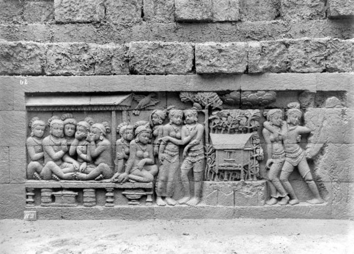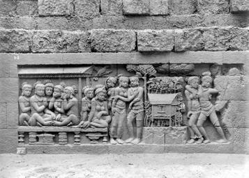 Keywords: COLLECTIE TROPENMUSEUM Reliëf O 119 op de verborgen voet van de Borobudur TMnr 10015856.jpg Borobudur te zien is De verborgen voet van de Borobudur is de oorspronkelijke basis van het Buddhistische heiligdom dat rond 800 gebouwd is In een latere fase van de bouw werd deze basis verborgen waarschijnlijk om verzakking te verkomen De verborgen voet loopt om het hele bouwwerk heen en bevat 160 reliëfs die tezamen de Mahakarmawibhangga verbeelden een Mahayanistische tekst die de werking van de leer van Karma uiteenzet Deze leerrede wordt aan Buddha toegeschreven en handelt over oorzaak en gevolg N J Krom en Th van Erp duiden in hun standaardwerk over de Borobudur Beschrijving van Barabudur Den Haag Martinus Nijhoff 1920-1931 de reliëfs van de verborgen voet aan als serie O Op de reliëfs zijn voorbeelden van de theorie uitgebeeld goede daden hebben goede gevolgen en slechte daden hebben slechte gevolgen De reliëfs vallen in twee delen uiteen O 1 tot en met O 117 verbeelden een aantal daden die leiden tot één en hetzelfde gevolg De reliëfs O 118 tot en met O 160 tonen verschillende gevolgen van één oorzaak De uiteenzetting van de leer begint bij de trap aan de oostzijde en ontrolt zich met de klok mee om het bouwwerk heen De reliëfs moeten dan ook gelezen worden van rechts naar links Lange tijd was onbekend wat op de reliëfs van de verborgen voet stond afgebeeld Hoewel de reliëfs al in 1885 waren ontdekt door Dr Ir J W IJzerman 1851-1932 kon de Franse geleerde Sylvain Lévi pas in 1929 op het zesde Congres van het Oostersch Genootschap constateren dat het op de verborgen voet ging om een Buddhistische tekst Mahakarmawibhangga Lévi had in 1922 een manuscript uit 1411 met deze tekst ontdekt in Kathmandu Nepal De tekst bleek populair in de Burdhistische wereld te zijn en een aantal verwante teksten te hebben twee Chinese werken waarvan één vertaald was in 582 door Gautama Dharmaprajna en één tussen 980 en 1000 door T'ien si Tsai Daarnaast bevat de Tibetaanse Kanjur twee werken met de titel Karmawibhangga In 1933 publiceerde de archeoloog N J Krom een uitgebreide analyse van het Mahakarmawibhangga op de reliëfs van de bedolven voet Hierin legt hij een relatie tussen de afbeeldingen op de reliëfs en de tekstpassages in het Mahakarmawibhangga Reliëf O 119 bevindt zich aan de noordzijde van de Borobudur en heeft volgens N J Krom betrekking op de paragrafen 54 en 55 van het Mahakarmawibhangga LIV Door het rijpen van het slechte pad van de daad het plegen van verkeerde liefde worden op de aarde de grassen kruiden enz onaangenaam van reuk; ook komt men door het rijpen van die daad een welvoorzien huis binnen Hier moet men reciteren enz Krom meent dat de tekst hier niet klopt Het gevolg van de ongeoorloofde liefde is volgens hem dat men het welvoorziene huis niet binnenkomt of dat het huis waar men wel komt niet welvoorzien is In ieder geval is er sprake van gewassen en een huis Op reliëf O 119a omhelst een man een vrouw; hij is de vertegenwoordiger van de verkeerde liefde Een derde persoon met zwaard of stok is niet uitgewerkt Daarnaast toont O 119b alleen een huisje temidden van allerlei hoog opschietende gewassen LV Door het rijpen van het slechte pad van de daad de leugen ontstaan mondziekten tandziekten keelziekten slechte reuk uit de mond enz ; ook hecht men door het rijpen van die daad aan onwaar gepraat De tweede helft van 119 is gewijd aan deze paragraaf en vooral duidelijk op 119d waar een paar mensen met de hand voor de mond hun ziekten van dat lichaamsdeel illustreren Op 119c zijn een man en vrouw met elkaar in gesprek De vrouw wijst op daarnaast zittende vrouwen; de leugen Uit N J Krom Het Karmawibhangga op Barabudur Mededeelingen der koninklijke academie van wetenschappen afdeeling letterkunde deel 76 serie B No 8 Amsterdam Noordhollandsche Uitgevers-Maatschappij 1933 253-255 Bronnen A J Bernet Kempers Borobudur Mysteriegebeuren in steen Verval en restauratie Oudjavaans volksleven Wassenaar 1973/gewijzigde herdruk ; Van Erp Th Krom N J Beschrijving van Barabudur Den Haag Martinus Nijhoff 1920-1931 ; N J Krom Het Karmawibhangga op Barabudur Mededeelingen der koninklijke academie van wetenschappen afdeeling letterkunde deel 76 serie B No 8 Amsterdam Noordhollandsche Uitgevers-Maatschappij 1933 Reliëf O 119 op de verborgen voet van de Borobudur 1890-1891 institution Tropenmuseum KIT-source 10015856 Creator Kassian Cephas |