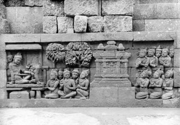 Keywords: COLLECTIE TROPENMUSEUM Reliëf O 124 op de verborgen voet van de Borobudur TMnr 10015861.jpg nl Negatief Negatief waarop reliëf O 124 van de verborgen voet van de Borobudur te zien is De verborgen voet van de Borobudur is de oorspronkelijke basis van het Buddhistische heiligdom dat rond 800 gebouwd is In een latere fase van de bouw werd deze basis verborgen waarschijnlijk om verzakking te verkomen De verborgen voet loopt om het hele bouwwerk heen en bevat 160 reliëfs die tezamen de Mahakarmawibhangga verbeelden een Mahayanistische tekst die de werking van de leer van Karma uiteenzet Deze leerrede wordt aan Buddha toegeschreven en handelt over oorzaak en gevolg N J Krom en Th van Erp duiden in hun standaardwerk over de Borobudur Beschrijving van Barabudur Den Haag Martinus Nijhoff 1920-1931 de reliëfs van de verborgen voet aan als serie O Op de reliëfs zijn voorbeelden van de theorie uitgebeeld goede daden hebben goede gevolgen en slechte daden hebben slechte gevolgen De reliëfs vallen in twee delen uiteen O 1 tot en met O 117 verbeelden een aantal daden die leiden tot één en hetzelfde gevolg De reliëfs O 118 tot en met O 160 tonen verschillende gevolgen van één oorzaak De uiteenzetting van de leer begint bij de trap aan de oostzijde en ontrolt zich met de klok mee om het bouwwerk heen De reliëfs moeten dan ook gelezen worden van rechts naar links Lange tijd was onbekend wat op de reliëfs van de verborgen voet stond afgebeeld Hoewel de reliëfs al in 1885 waren ontdekt door Dr Ir J W IJzerman 1851-1932 kon de Franse geleerde Sylvain Lévi pas in 1929 op het zesde Congres van het Oostersch Genootschap constateren dat het op de verborgen voet ging om een Buddhistische tekst Mahakarmawibhangga Lévi had in 1922 een manuscript uit 1411 met deze tekst ontdekt in Kathmandu Nepal De tekst bleek populair in de Burdhistische wereld te zijn en een aantal verwante teksten te hebben twee Chinese werken waarvan één vertaald was in 582 door Gautama Dharmaprajna en één tussen 980 en 1000 door T'ien si Tsai Daarnaast bevat de Tibetaanse Kanjur twee werken met de titel Karmawibhangga In 1933 publiceerde de archeoloog N J Krom een uitgebreide analyse van het Mahakarmawibhangga op de reliëfs van de bedolven voet Hierin legt hij een relatie tussen de afbeeldingen op de reliëfs en de tekstpassages in het Mahakarmawibhangga Reliëf O 124 bevindt zich aan de noordzijde van de Borobudur en heeft volgens N J Krom betrekking op paragrafen 63 van het Mahakarmawibhangga LXIII Welke zijn de tien voordelen van het vereren van de heiligdommen van de Tathagata Antwoord men wordt schoon; men heeft een mooi geluid; men spreekt overtuigend; wanneer men in een gezelschap is gekomen wint men de genegenheid van het gezelschap; men is geliefd bij goden en mensen; men wordt een groot persoon; men heeft omgang met lieden die grote personen zijn; men heeft omgang met Buddha's en Buddha-hoorders; men heeft een rijke positie; men wordt herboren in de hemel; men bereikt spoedig het Parinirwana Dat zijn de tien voordelen van het vereren van de heiligdommen van de Tathagata Op O 124a zien we een aantal vereerders knielen en staan voor een tempelgebouwtje de inscriptie 'caityawandana' is het woord dat in de tekst gebruikt wordt voor een heiligdom De gevolgen van deze verdienstelijke daad zijn op O 124b O 125 en O 126 weergegeven De man die op O 124b in een paviljoen met een ander zit te praten onderscheidt zich door niets bijzonder maar is volgens de inscriptie 'suwarnawarna' goudkleurig Krom acht het waarschijnlijk dat het de bedoeling is geweest dat hij door de stuco-laag die ooit het monument bedekte ook daadwerkelijk goudkleurig leek Krom wijst erop dat 'suwarnawarna' niet in de tekst staat maar 'abhirupo' schoon De Franse oriëntalist en indologist Sylvain Lévi wijst erop dat goudkleurig wel in de Tibetaanse tekst voorkomt Onder het gevolg van de aanzienlijke man op O 125a bevinden zich muzikanten De inscriptie boven het reliëf luidt 'suswara' schoon van geluid Op O 125b zijn een paar rijk geklede mannen in gesprek volgens de inscriptie is dit een 'mahaujaskasamawadhana' een ontmoeting tussen grootmachtigen Op reliëf O 126a zien we een zeer rijke man met zijn gevolg Hij is 'bhogi' rijk gefortuneerd en heeft zelfs een aureool gekregen Hiermee is de beeldhouwer volgens Krom vooruit gelopen op het volgende tafereel waarboven de inscriptie 'swargga' hemel staat Dit tagereel is voorzien van een hemelboom juwelenpotten en kinnara's wezens die half mens half vogel zijn Een god met een aureool zit temidden van dienende vrouwen Uit N J Krom Het Karmawibhangga op Barabudur Mededeelingen der koninklijke academie van wetenschappen afdeeling letterkunde deel 76 serie B No 8 Amsterdam Noordhollandsche Uitgevers-Maatschappij 1933 259 Bronnen A J Bernet Kempers Borobudur Mysteriegebeuren in steen Verval en restauratie Oudjavaans volksleven Wassenaar 1973/gewijzigde herdruk ; Van Erp Th Krom N J Beschrijving van Barabudur Den Haag Martinus Nijhoff 1920-1931 ; N J Krom Het Karmawibhangga op Barabudur Mededeelingen der koninklijke academie van wetenschappen afdeeling letterkunde deel 76 serie B No 8 Amsterdam Noordhollandsche Uitgevers-Maatschappij 1933 Reliëf O 124 op de verborgen voet van de Borobudur 1890-1891 institution Tropenmuseum KIT-source 10015861 Creator Kassian Cephas Borobudur in 1890 Black and white photographs |