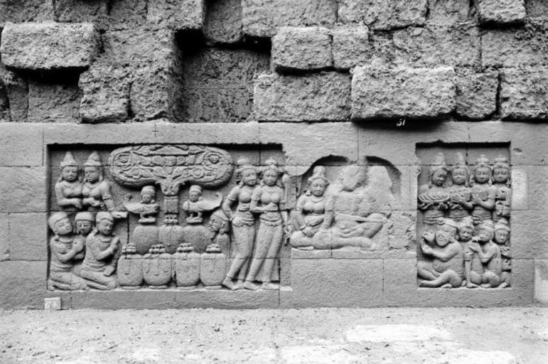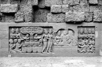 | Keywords: COLLECTIE TROPENMUSEUM Reliëf O 130 op de verborgen voet van de Borobudur TMnr 10015867.jpg  nl Negatief Negatief waarop reliëf O 130 van de verborgen voet van de Borobudur te zien is De verborgen voet van de Borobudur is de oorspronkelijke basis van het Buddhistische heiligdom dat rond 800 gebouwd is In een latere fase van de bouw werd deze basis verborgen waarschijnlijk om verzakking te verkomen De verborgen voet loopt om het hele bouwwerk heen en bevat 160 reliëfs die tezamen de Mahakarmawibhangga verbeelden een Mahayanistische tekst die de werking van de leer van Karma uiteenzet Deze leerrede wordt aan Buddha toegeschreven en handelt over oorzaak en gevolg N J Krom en Th van Erp duiden in hun standaardwerk over de Borobudur Beschrijving van Barabudur Den Haag Martinus Nijhoff 1920-1931 de reliëfs van de verborgen voet aan als serie O Op de reliëfs zijn voorbeelden van de theorie uitgebeeld goede daden hebben goede gevolgen en slechte daden hebben slechte gevolgen De reliëfs vallen in twee delen uiteen O 1 tot en met O 117 verbeelden een aantal daden die leiden tot één en hetzelfde gevolg De reliëfs O 118 tot en met O 160 tonen verschillende gevolgen van één oorzaak De uiteenzetting van de leer begint bij de trap aan de oostzijde en ontrolt zich met de klok mee om het bouwwerk heen De reliëfs moeten dan ook gelezen worden van rechts naar links Lange tijd was onbekend wat op de reliëfs van de verborgen voet stond afgebeeld Hoewel de reliëfs al in 1885 waren ontdekt door Dr Ir J W IJzerman 1851-1932 kon de Franse geleerde Sylvain Lévi pas in 1929 op het zesde Congres van het Oostersch Genootschap constateren dat het op de verborgen voet ging om een Buddhistische tekst Mahakarmawibhangga Lévi had in 1922 een manuscript uit 1411 met deze tekst ontdekt in Kathmandu Nepal De tekst bleek populair in de Burdhistische wereld te zijn en een aantal verwante teksten te hebben twee Chinese werken waarvan één vertaald was in 582 door Gautama Dharmaprajna en één tussen 980 en 1000 door T'ien si Tsai Daarnaast bevat de Tibetaanse Kanjur twee werken met de titel Karmawibhangga In 1933 publiceerde de archeoloog N J Krom een uitgebreide analyse van het Mahakarmawibhangga op de reliëfs van de bedolven voet Hierin legt hij een relatie tussen de afbeeldingen op de reliëfs en de tekstpassages in het Mahakarmawibhangga Reliëf O 130 bevindt zich aan de noordzijde van de Borobudur en heeft volgens N J Krom betrekking op paragraaf 64 van het Mahakarmawibhangga LXIV Welke zijn de tien voordelen van de gift van een zonnescherm Antwoord men wordt het zonnescherm van de wereld; men heeft geen branding van het lichaam men heeft geen branding van de geest; alle daden die men doet om tot de heerschappij te raken hebben voorspoed; men wordt herhaaldelijk wereldbeheersende koning; men wordt een groot persoon; men heeft omgang met lieden die grote personen zijn; men heeft omgang met Buddha's en Buddha-hoorders; men heeft een rijke positie; men wordt herboren in de hemels; men bereikt spoedig het Parinirwana Hierbij verhaalt men enz Dit zijn de tien voordelen van de gift van een zonnescherm Deze paragraaf heeft betrekking op vier reliëfs O 127 tot en met O 130 Op reliëf O 127a knielt een man Hij is in het gezelschap van twee vrouwen en bevindt zich voor een zittende brahmaan Op de achtergrond staan twee zonneschermen De inscriptie boven het reliëf luidt chatradana' gift van een zonnescherm Boven O 127b staat de inscriptie nirupataptakayacitta ongebrand van lichaam en geest boven een aanzienlijke man in een paviljoen met zijn gezin en personneel Dit correspondeert met de tekst Het hele reliëf O 128 wordt gevuld door een gesprek van voorname lieden met hun gevolg en vrouwen Boven het reliëf is de inscriptie 'mahesakhyasamawadhana' ontmoeting met grote personen aangebracht Ook O 129 en O 130 tonen maar één tafereel Op O 129 is de wereldheerser te zien met de inscriptie 'cakrawartti'; hij is in het gezelschap van zijn gemalin olifant paard edelsteen en werprad tussen een talrijk gevolg Op O 130 is een hemel afgebeeld; een god met vrouwen dienaren en dienaressen een hemelboom juwelenpotten en kinnara's half mens half vogel Uit N J Krom Het Karmawibhangga op Barabudur Mededeelingen der koninklijke academie van wetenschappen afdeeling letterkunde deel 76 serie B No 8 Amsterdam Noordhollandsche Uitgevers-Maatschappij 1933 260-261 Bronnen A J Bernet Kempers Borobudur Mysteriegebeuren in steen Verval en restauratie Oudjavaans volksleven Wassenaar 1973/gewijzigde herdruk ; Van Erp Th Krom N J Beschrijving van Barabudur Den Haag Martinus Nijhoff 1920-1931 ; N J Krom Het Karmawibhangga op Barabudur Mededeelingen der koninklijke academie van wetenschappen afdeeling letterkunde deel 76 serie B No 8 Amsterdam Noordhollandsche Uitgevers-Maatschappij 1933 Reliëf O 130 op de verborgen voet van de Borobudur 1890-1891 institution Tropenmuseum KIT-source 10015867 Creator Kassian Cephas Borobudur in 1890 Black and white photographs |