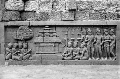Keywords: COLLECTIE TROPENMUSEUM Reliëf O 141 op de verborgen voet van de Borobudur TMnr 10015877.jpg nl Negatief Negatief waarop reliëf O 141 van de verborgen voet van de Borobudur te zien is De verborgen voet van de Borobudur is de oorspronkelijke basis van het Buddhistische heiligdom dat rond 800 gebouwd is In een latere fase van de bouw werd deze basis verborgen waarschijnlijk om verzakking te verkomen De verborgen voet loopt om het hele bouwwerk heen en bevat 160 reliëfs die tezamen de Mahakarmawibhangga verbeelden een Mahayanistische tekst die de werking van de leer van Karma uiteenzet Deze leerrede wordt aan Buddha toegeschreven en handelt over oorzaak en gevolg N J Krom en Th van Erp duiden in hun standaardwerk over de Borobudur Beschrijving van Barabudur Den Haag Martinus Nijhoff 1920-1931 de reliëfs van de verborgen voet aan als serie O Op de reliëfs zijn voorbeelden van de theorie uitgebeeld goede daden hebben goede gevolgen en slechte daden hebben slechte gevolgen De reliëfs vallen in twee delen uiteen O 1 tot en met O 117 verbeelden een aantal daden die leiden tot één en hetzelfde gevolg De reliëfs O 118 tot en met O 160 tonen verschillende gevolgen van één oorzaak De uiteenzetting van de leer begint bij de trap aan de oostzijde en ontrolt zich met de klok mee om het bouwwerk heen De reliëfs moeten dan ook gelezen worden van rechts naar links Lange tijd was onbekend wat op de reliëfs van de verborgen voet stond afgebeeld Hoewel de reliëfs al in 1885 waren ontdekt door Dr Ir J W IJzerman kon de Franse geleerde Sylvain Lévi pas in 1929 op het zesde Congres van het Oostersch Genootschap constateren dat het op de verborgen voet ging om een Buddhistische tekst Mahakarmawibhangga Lévi had in 1922 een manuscript uit 1411 met deze tekst ontdekt in Kathmandu Nepal De tekst bleek populair in de Burdhistische wereld te zijn en een aantal verwante teksten te hebben twee Chinese werken waarvan één vertaald was in 582 door Gautama Dharmaprajna en één tussen 980 en 1000 door T'ien si Tsai Daarnaast bevat de Tibetaanse Kanjur twee werken met de titel Karmawibhangga In 1933 publiceerde de archeoloog N J Krom een uitgebreide analyse van het Mahakarmawibhangga op de reliëfs van de bedolven voet Hierin legt hij een relatie tussen de afbeeldingen op de reliëfs en de tekstpassages in het Mahakarmawibhangga Reliëf O 141 bevindt zich aan de oostzijde van de Borobudur en heeft volgens N J Krom betrekking op paragraaf 67 van het Mahakarmawibhangga in de Chinese versie Ch G LXVII Welke zijn de tien voordelen van de gift van een vaandel Antwoord men is een standaard in de wereld en wordt door de koning ministers verwanten vrienden enz vereerd; men is rijk onafhankelijk schatten bezittend; zijn roem wordt naar alle hemelstreken verbreid; men is levenslang schoon van uiterlijk; in volgende incarnaties is men vast en onveranderlijk van gedrag; men heeft grote waardigheid en deugd; men wordt herboren in voorname families; men wordt herboren in de hemels; men bereikt spoedig het Parinirwana Dit zijn de voordelen van de gift van een vaandel Deze paragraaf heeft betrekking op de reliëfs O 141 tot en met O 143 Boven O 141 staat de inscriptie 'pataka' vaandels en zijn voorwerpen afgebeeld die door een groep vereerders aan het heiligdom worden aangeboden Reliëf O 142 is geheel gewijd aan de aanzienlijke rijke man met gevolg en de inscriptie 'adhya-bhogi' zeer gefortuneerd Op O 143 zien we een soortgelijke persoon die een hemelgod voorstelt Er is geen inscriptie maar we zien een hemelboom juwelenpotten en kinnara's half mens half vogel De beeldhouwer heeft zich beperkt tot de steeds terugkerende rijke positie en de hergeboorte in de hemel Uit N J Krom Het Karmawibhangga op Barabudur Mededeelingen der koninklijke academie van wetenschappen afdeeling letterkunde deel 76 serie B No 8 Amsterdam Noordhollandsche Uitgevers-Maatschappij 1933 263-264 Bronnen A J Bernet Kempers Borobudur Mysteriegebeuren in steen Verval en restauratie Oudjavaans volksleven Wassenaar 1973/gewijzigde herdruk ; Van Erp Th Krom N J Beschrijving van Barabudur Den Haag Martinus Nijhoff 1920-1931 ; N J Krom Het Karmawibhangga op Barabudur Mededeelingen der koninklijke academie van wetenschappen afdeeling letterkunde deel 76 serie B No 8 Amsterdam Noordhollandsche Uitgevers-Maatschappij 1933 Reliëf O 141 op de verborgen voet van de Borobudur 1890-1891 institution Tropenmuseum KIT-source 10015877 Creator Kassian Cephas KIT-license PD-old-100 Tropenmuseum Borobudur reliefs Photographs by Kassian Cephas Borobudur in 1890 Black and white photographs |