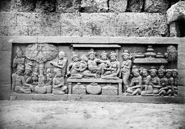Keywords: COLLECTIE TROPENMUSEUM Reliëf O 143 op de verborgen voet van de Borobudur TMnr 10015879.jpg nl Negatief Negatief waarop reliëf O 143 van de verborgen voet van de Borobudur te zien is De verborgen voet van de Borobudur is de oorspronkelijke basis van het Buddhistische heiligdom dat rond 800 gebouwd is In een latere fase van de bouw werd deze basis verborgen waarschijnlijk om verzakking te verkomen De verborgen voet loopt om het hele bouwwerk heen en bevat 160 reliëfs die tezamen de Mahakarmawibhangga verbeelden een Mahayanistische tekst die de werking van de leer van Karma uiteenzet Deze leerrede wordt aan Buddha toegeschreven en handelt over oorzaak en gevolg N J Krom en Th van Erp duiden in hun standaardwerk over de Borobudur Beschrijving van Barabudur Den Haag Martinus Nijhoff 1920-1931 de reliëfs van de verborgen voet aan als serie O Op de reliëfs zijn voorbeelden van de theorie uitgebeeld goede daden hebben goede gevolgen en slechte daden hebben slechte gevolgen De reliëfs vallen in twee delen uiteen O 1 tot en met O 117 verbeelden een aantal daden die leiden tot één en hetzelfde gevolg De reliëfs O 118 tot en met O 160 tonen verschillende gevolgen van één oorzaak De uiteenzetting van de leer begint bij de trap aan de oostzijde en ontrolt zich met de klok mee om het bouwwerk heen De reliëfs moeten dan ook gelezen worden van rechts naar links Lange tijd was onbekend wat op de reliëfs van de verborgen voet stond afgebeeld Hoewel de reliëfs al in 1885 waren ontdekt door Dr Ir J W IJzerman 1851-1932 kon de Franse geleerde Sylvain Lévi pas in 1929 op het zesde Congres van het Oostersch Genootschap constateren dat het op de verborgen voet ging om een Buddhistische tekst Mahakarmawibhangga Lévi had in 1922 een manuscript uit 1411 met deze tekst ontdekt in Kathmandu Nepal De tekst bleek populair in de Burdhistische wereld te zijn en een aantal verwante teksten te hebben twee Chinese werken waarvan één vertaald was in 582 door Gautama Dharmaprajna en één tussen 980 en 1000 door T'ien si Tsai Daarnaast bevat de Tibetaanse Kanjur twee werken met de titel Karmawibhangga In 1933 publiceerde de archeoloog N J Krom een uitgebreide analyse van het Mahakarmawibhangga op de reliëfs van de bedolven voet Hierin legt hij een relatie tussen de afbeeldingen op de reliëfs en de tekstpassages in het Mahakarmawibhangga Reliëf O 143 bevindt zich aan de oostzijde van de Borobudur en heeft volgens N J Krom betrekking op paragraaf 67 van het Mahakarmawibhangga in de Chinese versie Ch G LXVII Welke zijn de tien voordelen van de gift van een vaandel Antwoord men is een standaard in de wereld en wordt door de koning ministers verwanten vrienden enz vereerd; men is rijk onafhankelijk schatten bezittend; zijn roem wordt naar alle hemelstreken verbreid; men is levenslang schoon van uiterlijk; in volgende incarnaties is men vast en onveranderlijk van gedrag; men heeft grote waardigheid en deugd; men wordt herboren in voorname families; men wordt herboren in de hemels; men bereikt spoedig het Parinirwana Dit zijn de voordelen van de gift van een vaandel Deze paragraaf heeft betrekking op de reliëfs O 141 tot en met O 143 Boven O 141 staat de inscriptie 'pataka' vaandels en zijn voorwerpen afgebeeld die door een groep vereerders aan het heiligdom worden aangeboden Reliëf O 142 is geheel gewijd aan de aanzienlijke rijke man met gevolg en de inscriptie 'adhya-bhogi' zeer gefortuneerd Op O 143 zien we een soortgelijke persoon die een hemelgod voorstelt Er is geen inscriptie maar we zien een hemelboom juwelenpotten en kinnara's half mens half vogel De beeldhouwer heeft zich beperkt tot de steeds terugkerende rijke positie en de hergeboorte in de hemel Uit N J Krom Het Karmawibhangga op Barabudur Mededeelingen der koninklijke academie van wetenschappen afdeeling letterkunde deel 76 serie B No 8 Amsterdam Noordhollandsche Uitgevers-Maatschappij 1933 263-264 Bronnen A J Bernet Kempers Borobudur Mysteriegebeuren in steen Verval en restauratie Oudjavaans volksleven Wassenaar 1973/gewijzigde herdruk ; Van Erp Th Krom N J Beschrijving van Barabudur Den Haag Martinus Nijhoff 1920-1931 ; N J Krom Het Karmawibhangga op Barabudur Mededeelingen der koninklijke academie van wetenschappen afdeeling letterkunde deel 76 serie B No 8 Amsterdam Noordhollandsche Uitgevers-Maatschappij 1933 Reliëf O 143 op de verborgen voet van de Borobudur 1890-1891 institution Tropenmuseum KIT-source 10015879 Creator Kassian Cephas KIT-license PD-old-100 Tropenmuseum Borobudur reliefs Photographs by Kassian Cephas Borobudur in 1890 Black and white photographs |