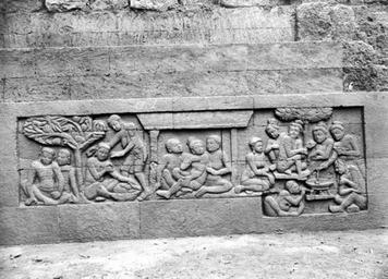 Keywords: COLLECTIE TROPENMUSEUM Reliëf O 15 op de verborgen voet van de Borobudur TMnr 10015753.jpg nl Negatief Negatief waarop reliëf O 15 van de verborgen voet van de Borobudur te zien is De verborgen voet van de Borobudur is de oorspronkelijke basis van het Buddhistische heiligdom dat rond 800 gebouwd is In een latere fase van de bouw werd deze basis verborgen waarschijnlijk om verzakking te verkomen De verborgen voet loopt om het hele bouwwerk heen en bevat 160 reliëfs die tezamen de Mahakarmawibhangga verbeelden een Mahayanistische tekst die de werking van de leer van Karma uiteenzet Deze leerrede wordt aan Buddha toegeschreven en handelt over oorzaak en gevolg N J Krom en Th van Erp duiden in hun standaardwerk over de Borobudur Beschrijving van Barabudur Den Haag Martinus Nijhoff 1920-1931 de reliëfs van de verborgen voet aan als serie O Op de reliëfs zijn voorbeelden van de theorie uitgebeeld goede daden hebben goede gevolgen en slechte daden hebben slechte gevolgen De reliëfs vallen in twee delen uiteen O 1 tot en met O 117 verbeelden een aantal daden die leiden tot één en hetzelfde gevolg De reliëfs O 118 tot en met O 160 tonen verschillende gevolgen van één oorzaak De uiteenzetting van de leer begint bij de trap aan de oostzijde en ontrolt zich met de klok mee om het bouwwerk heen De reliëfs moeten dan ook gelezen worden van rechts naar links Lange tijd was onbekend wat op de reliëfs van de verborgen voet stond afgebeeld Hoewel de reliëfs al in 1885 waren ontdekt door Dr Ir J W IJzerman 1851-1932 kon de Franse geleerde Sylvain Lévi pas in 1929 op het zesde Congres van het Oostersch Genootschap constateren dat het op de verborgen voet ging om een Buddhistische tekst Mahakarmawibhangga Lévi had in 1922 een manuscript uit 1411 met deze tekst ontdekt in Kathmandu Nepal De tekst bleek populair in de Burdhistische wereld te zijn en een aantal verwante teksten te hebben twee Chinese werken waarvan één vertaald was in 582 door Gautama Dharmaprajna en één tussen 980 en 1000 door T'ien si Tsai Daarnaast bevat de Tibetaanse Kanjur twee werken met de titel Karmawibhangga In 1933 publiceerde de archeoloog N J Krom een uitgebreide analyse van het Mahakarmawibhangga op de reliëfs van de bedolven voet Hierin legt hij een relatie tussen de afbeeldingen op de reliëfs en de tekstpassages in het Mahakarmawibhangga Reliëf O 15 bevindt zich aan de oostzijde van de Borobudur en correspondeert volgens N J Krom met de derde paragraaf van het Mahakarmawibhangga Wat is de daad die veel pijnen ten gevolge heeft Antwoord het geven van stompen en slagen; het zich verheugen in het geven van stompen en slagen; het prijzen van het geven van stompen en slagen; er tevreden over zijn dat deze gegeven worden; het kwellen van vader en moeder naar geest en lichaam en desgelijks van anderen deugdzame zwervende geestelijken de geest te doen lijden; tevreden zijn over de ziekte van een vijand; ontevreden zijn over het herstel van een vijand; het geven van ondeugdelijke geneesmiddelen aan zieken zo ook voedsel dat niet verteert Dat is de daad die veel pijnen ten gevolge heeft Uit N J Krom Het Karmawibhangga op Barabudur Mededeelingen der koninklijke academie van wetenschappen afdeeling letterkunde deel 76 serie B No 8 Amsterdam Noordhollandsche Uitgevers-Maatschappij 1933 221 De vele pijnen zijn te zien op het linkertafereel op de reliëfs O 13 tot en met O 15 Reliëf O 15a wordt gekookt; waarschijnlijk ondeugdelijke geneesmiddelen volgens Krom Op 15b en 15c is te zien welke slechte gevolgen die geneesmiddelen en onverteerbaar voedsel hebben Bronnen A J Bernet Kempers Borobudur Mysteriegebeuren in steen Verval en restauratie Oudjavaans volksleven Wassenaar 1973/gewijzigde herdruk ; Van Erp Th Krom N J Beschrijving van Barabudur Den Haag Martinus Nijhoff 1920-1931 ; N J Krom Het Karmawibhangga op Barabudur Mededeelingen der koninklijke academie van wetenschappen afdeeling letterkunde deel 76 serie B No 8 Amsterdam Noordhollandsche Uitgevers-Maatschappij 1933 Reliëf O 15 op de verborgen voet van de Borobudur 1890-1891 institution Tropenmuseum KIT-source 10015753 Creator Kassian Cephas KIT-license PD-old-100 Photographs by Kassian Cephas Tropenmuseum Borobudur reliefs Borobudur in 1890 Black and white photographs |
