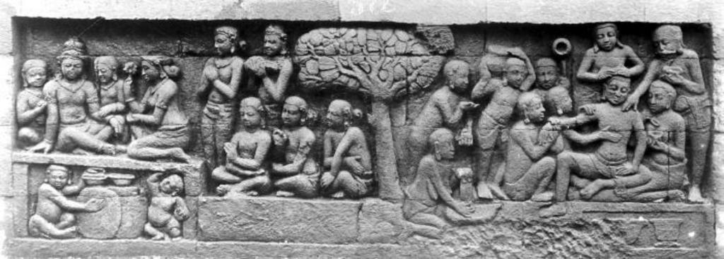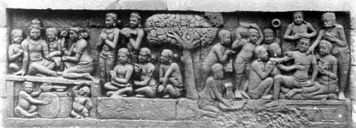 Keywords: COLLECTIE TROPENMUSEUM Reliëf O 19 op de verborgen voet van de Borobudur TMnr 10015757.jpg nl Repronegatief Negatief waarop reliëf O 19 van de verborgen voet van de Borobudur te zien is De verborgen voet van de Borobudur is de oorspronkelijke basis van het Buddhistische heiligdom dat rond 800 gebouwd is In een latere fase van de bouw werd deze basis verborgen waarschijnlijk om verzakking te verkomen De verborgen voet loopt om het hele bouwwerk heen en bevat 160 reliëfs die tezamen de Mahakarmawibhangga verbeelden een Mahayanistische tekst die de werking van de leer van Karma uiteenzet Deze leerrede wordt aan Buddha toegeschreven en handelt over oorzaak en gevolg N J Krom en Th van Erp duiden in hun standaardwerk over de Borobudur Beschrijving van Barabudur Den Haag Martinus Nijhoff 1920-1931 de reliëfs van de verborgen voet aan als serie O Op de reliëfs zijn voorbeelden van de theorie uitgebeeld goede daden hebben goede gevolgen en slechte daden hebben slechte gevolgen De reliëfs vallen in twee delen uiteen O 1 tot en met O 117 verbeelden een aantal daden die leiden tot één en hetzelfde gevolg De reliëfs O 118 tot en met O 160 tonen verschillende gevolgen van één oorzaak De uiteenzetting van de leer begint bij de trap aan de oostzijde en ontrolt zich met de klok mee om het bouwwerk heen De reliëfs moeten dan ook gelezen worden van rechts naar links Lange tijd was onbekend wat op de reliëfs van de verborgen voet stond afgebeeld Hoewel de reliëfs al in 1885 waren ontdekt door Dr Ir J W IJzerman 1851-1932 kon de Franse geleerde Sylvain Lévi pas in 1929 op het zesde Congres van het Oostersch Genootschap constateren dat het op de verborgen voet ging om een Buddhistische tekst Mahakarmawibhangga Lévi had in 1922 een manuscript uit 1411 met deze tekst ontdekt in Kathmandu Nepal De tekst bleek populair in de Burdhistische wereld te zijn en een aantal verwante teksten te hebben twee Chinese werken waarvan één vertaald was in 582 door Gautama Dharmaprajna en één tussen 980 en 1000 door T'ien si Tsai Daarnaast bevat de Tibetaanse Kanjur twee werken met de titel Karmawibhangga In 1933 publiceerde de archeoloog N J Krom een uitgebreide analyse van het Mahakarmawibhangga op de reliëfs van de bedolven voet Hierin legt hij een relatie tussen de afbeeldingen op de reliëfs en de tekstpassages in het Mahakarmawibhangga Reliëf O 19 bevindt zich aan de oostzijde van de Borobudur en correspondeert volgens N J Krom met de vierde paragraaf van het Mahakarmawibhangga Wat is de daad die weinig pijnen ten gevolge heeft Antwoord het afzien van het geven van stompen en slagen; het aanzetten daartoe; het prijzen daarvan; het zich daar hogelijk op verheugen; zijn uitgeputte vader en moeder van dienst zijn en ook anderen huisvaders en zwervende geestelijken; niet tevreden zijn over de ziekte van een vijand; tevreden zijn met diens herstel; het geven van geneesmiddelen en goed verteerbaar voedsel Dat is de daad die weinig pijnen ten gevolge heeft Uit N J Krom Het Karmawibhangga op Barabudur Mededeelingen der koninklijke academie van wetenschappen afdeeling letterkunde deel 76 serie B No 8 Amsterdam Noordhollandsche Uitgevers-Maatschappij 1933 222 De beeldhouwer toont de toestand van weinig pijnen op reliëfs O 16 tot en met O 19 door middel van de afbeelding van een aanzienlijke man met zijn gezin en dienaren Op 19a krijgt een zieke persoon geneesmiddelen en voedsel Uit zijn houding blijkt volgens Krom dat die hem goed doen Bronnen A J Bernet Kempers Borobudur Mysteriegebeuren in steen Verval en restauratie Oudjavaans volksleven Wassenaar 1973/gewijzigde herdruk ; Van Erp Th Krom N J Beschrijving van Barabudur Den Haag Martinus Nijhoff 1920-1931 ; N J Krom Het Karmawibhangga op Barabudur Mededeelingen der koninklijke academie van wetenschappen afdeeling letterkunde deel 76 serie B No 8 Amsterdam Noordhollandsche Uitgevers-Maatschappij 1933 Reliëf O 19 op de verborgen voet van de Borobudur 1890-1891 institution Tropenmuseum KIT-source 10015757 Creator Kassian Cephas KIT-license PD-old-100 Photographs by Kassian Cephas Tropenmuseum Borobudur reliefs Borobudur in 1890 Black and white photographs |
