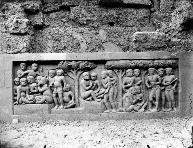 Keywords: COLLECTIE TROPENMUSEUM Reliëf O 21 op de verborgen voet van de Borobudur TMnr 10015759.jpg nl Negatief Negatief waarop reliëf O 21 van de verborgen voet van de Borobudur te zien is De verborgen voet van de Borobudur is de oorspronkelijke basis van het Buddhistische heiligdom dat rond 800 gebouwd is In een latere fase van de bouw werd deze basis verborgen waarschijnlijk om verzakking te verkomen De verborgen voet loopt om het hele bouwwerk heen en bevat 160 reliëfs die tezamen de Mahakarmawibhangga verbeelden een Mahayanistische tekst die de werking van de leer van Karma uiteenzet Deze leerrede wordt aan Buddha toegeschreven en handelt over oorzaak en gevolg N J Krom en Th van Erp duiden in hun standaardwerk over de Borobudur Beschrijving van Barabudur Den Haag Martinus Nijhoff 1920-1931 de reliëfs van de verborgen voet aan als serie O Op de reliëfs zijn voorbeelden van de theorie uitgebeeld goede daden hebben goede gevolgen en slechte daden hebben slechte gevolgen De reliëfs vallen in twee delen uiteen O 1 tot en met O 117 verbeelden een aantal daden die leiden tot één en hetzelfde gevolg De reliëfs O 118 tot en met O 160 tonen verschillende gevolgen van één oorzaak De uiteenzetting van de leer begint bij de trap aan de oostzijde en ontrolt zich met de klok mee om het bouwwerk heen De reliëfs moeten dan ook gelezen worden van rechts naar links Lange tijd was onbekend wat op de reliëfs van de verborgen voet stond afgebeeld Hoewel de reliëfs al in 1885 waren ontdekt door Dr Ir J W IJzerman 1851-1932 kon de Franse geleerde Sylvain Lévi pas in 1929 op het zesde Congres van het Oostersch Genootschap constateren dat het op de verborgen voet ging om een Buddhistische tekst Mahakarmawibhangga Lévi had in 1922 een manuscript uit 1411 met deze tekst ontdekt in Kathmandu Nepal De tekst bleek populair in de Burdhistische wereld te zijn en een aantal verwante teksten te hebben twee Chinese werken waarvan één vertaald was in 582 door Gautama Dharmaprajna en één tussen 980 en 1000 door T'ien si Tsai Daarnaast bevat de Tibetaanse Kanjur twee werken met de titel Karmawibhangga In 1933 publiceerde de archeoloog N J Krom een uitgebreide analyse van het Mahakarmawibhangga op de reliëfs van de bedolven voet Hierin legt hij een relatie tussen de afbeeldingen op de reliëfs en de tekstpassages in het Mahakarmawibhangga Reliëf O 21 bevindt zich aan de zuidzijde van de Borobudur en correspondeert volgens N J Krom met de vijfde paragraaf van het Mahakarmawibhangga Wat is de daad die wanstaltigheid ten gevolge heeft Antwoord toorn; haatdragendheid; geveinsdheid; bitsheid; kwaadspreken van vader en moeder en van anderen huisvaders en zwervende geestelijken kinderen en grijsaards; het niet schoonhouden van den grond van stupa-hoven caitya-monumenten en kloosters; het vernielen van lampen van stupa's en beelden; het uitlachen van wanstaltige wezens; desgelijks een onbehoorlijk gedrag Dat is de daad die wanstaltigheid ten gevolge heeft Uit N J Krom Het Karmawibhangga op Barabudur Mededeelingen der koninklijke academie van wetenschappen afdeeling letterkunde deel 76 serie B No 8 Amsterdam Noordhollandsche Uitgevers-Maatschappij 1933 222 De reliëfs O 21 tot en met O 25 tonen monsterachtige figuren Op het rechtergedeelte van O 21 is het eerste gedeelte van de paragraaf verbeeld; woede; haatdragendheid; geveinsdheid; bitsheid Op O 21b en O 21c staan monsterachtige figuren afgebeeld Boven O 21c staat een inscriptie in het Oud-Javaans maar in Sanskriet schrift wirupa wat monsterachtig betekent Krom merkt op dat het opvallend is dat dit woord niet in de tekst wordt gebruikt maar wel in de volgende paragraaf Bronnen A J Bernet Kempers Borobudur Mysteriegebeuren in steen Verval en restauratie Oudjavaans volksleven Wassenaar 1973/gewijzigde herdruk ; Van Erp Th Krom N J Beschrijving van Barabudur Den Haag Martinus Nijhoff 1920-1931 ; N J Krom Het Karmawibhangga op Barabudur Mededeelingen der koninklijke academie van wetenschappen afdeeling letterkunde deel 76 serie B No 8 Amsterdam Noordhollandsche Uitgevers-Maatschappij 1933 Reliëf O 21 op de verborgen voet van de Borobudur 1890-1891 institution Tropenmuseum KIT-source 10015759 Creator Kassian Cephas KIT-license PD-old-100 Photographs by Kassian Cephas Tropenmuseum Borobudur reliefs Borobudur in 1890 Black and white photographs |