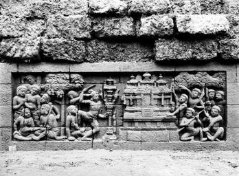 Keywords: COLLECTIE TROPENMUSEUM Reliëf O 24 op de verborgen voet van de Borobudur TMnr 10015762.jpg nl Negatief Negatief waarop reliëf O 24 van de verborgen voet van de Borobudur te zien is De verborgen voet van de Borobudur is de oorspronkelijke basis van het Buddhistische heiligdom dat rond 800 gebouwd is In een latere fase van de bouw werd deze basis verborgen waarschijnlijk om verzakking te verkomen De verborgen voet loopt om het hele bouwwerk heen en bevat 160 reliëfs die tezamen de Mahakarmawibhangga verbeelden een Mahayanistische tekst die de werking van de leer van Karma uiteenzet Deze leerrede wordt aan Buddha toegeschreven en handelt over oorzaak en gevolg N J Krom en Th van Erp duiden in hun standaardwerk over de Borobudur Beschrijving van Barabudur Den Haag Martinus Nijhoff 1920-1931 de reliëfs van de verborgen voet aan als serie O Op de reliëfs zijn voorbeelden van de theorie uitgebeeld goede daden hebben goede gevolgen en slechte daden hebben slechte gevolgen De reliëfs vallen in twee delen uiteen O 1 tot en met O 117 verbeelden een aantal daden die leiden tot één en hetzelfde gevolg De reliëfs O 118 tot en met O 160 tonen verschillende gevolgen van één oorzaak De uiteenzetting van de leer begint bij de trap aan de oostzijde en ontrolt zich met de klok mee om het bouwwerk heen De reliëfs moeten dan ook gelezen worden van rechts naar links Lange tijd was onbekend wat op de reliëfs van de verborgen voet stond afgebeeld Hoewel de reliëfs al in 1885 waren ontdekt door Dr Ir J W IJzerman 1851-1932 kon de Franse geleerde Sylvain Lévi pas in 1929 op het zesde Congres van het Oostersch Genootschap constateren dat het op de verborgen voet ging om een Buddhistische tekst Mahakarmawibhangga Lévi had in 1922 een manuscript uit 1411 met deze tekst ontdekt in Kathmandu Nepal De tekst bleek populair in de Burdhistische wereld te zijn en een aantal verwante teksten te hebben twee Chinese werken waarvan één vertaald was in 582 door Gautama Dharmaprajna en één tussen 980 en 1000 door T'ien si Tsai Daarnaast bevat de Tibetaanse Kanjur twee werken met de titel Karmawibhangga In 1933 publiceerde de archeoloog N J Krom een uitgebreide analyse van het Mahakarmawibhangga op de reliëfs van de bedolven voet Hierin legt hij een relatie tussen de afbeeldingen op de reliëfs en de tekstpassages in het Mahakarmawibhangga Reliëf O 24 bevindt zich aan de zuidzijde van de Borobudur en correspondeert volgens N J Krom met de vijfde paragraaf van het Mahakarmawibhangga Wat is de daad die wanstaltigheid ten gevolge heeft Antwoord toorn; haatdragendheid; geveinsdheid; bitsheid; kwaadspreken van vader en moeder en van anderen huisvaders en zwervende geestelijken kinderen en grijsaards; het niet schoonhouden van den grond van stupa-hoven caitya-monumenten en kloosters; het vernielen van lampen van stupa's en beelden; het uitlachen van wanstaltige wezens; desgelijks een onbehoorlijk gedrag Dat is de daad die wanstaltigheid ten gevolge heeft Uit N J Krom Het Karmawibhangga op Barabudur Mededeelingen der koninklijke academie van wetenschappen afdeeling letterkunde deel 76 serie B No 8 Amsterdam Noordhollandsche Uitgevers-Maatschappij 1933 222 De reliëfs O 21 tot en met O 25 tonen monsterachtige figuren Op 24a wordt een grote lamp die naast een heiligdom staat vernield Bronnen A J Bernet Kempers Borobudur Mysteriegebeuren in steen Verval en restauratie Oudjavaans volksleven Wassenaar 1973/gewijzigde herdruk ; Van Erp Th Krom N J Beschrijving van Barabudur Den Haag Martinus Nijhoff 1920-1931 ; N J Krom Het Karmawibhangga op Barabudur Mededeelingen der koninklijke academie van wetenschappen afdeeling letterkunde deel 76 serie B No 8 Amsterdam Noordhollandsche Uitgevers-Maatschappij 1933 Reliëf O 24 op de verborgen voet van de Borobudur 1890-1891 institution Tropenmuseum KIT-source 10015762 Creator Kassian Cephas KIT-license PD-old-100 Photographs by Kassian Cephas Tropenmuseum Borobudur reliefs Borobudur in 1890 Black and white photographs |