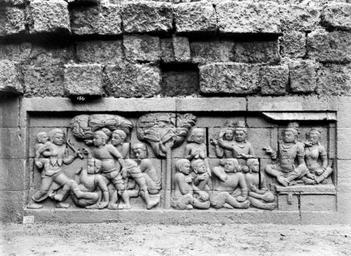 Keywords: COLLECTIE TROPENMUSEUM Reliëf O 25 op de verborgen voet van de Borobudur TMnr 10015763.jpg nl Negatief Negatief waarop reliëf O 25 van de verborgen voet van de Borobudur te zien is De verborgen voet van de Borobudur is de oorspronkelijke basis van het Buddhistische heiligdom dat rond 800 gebouwd is In een latere fase van de bouw werd deze basis verborgen waarschijnlijk om verzakking te verkomen De verborgen voet loopt om het hele bouwwerk heen en bevat 160 reliëfs die tezamen de Mahakarmawibhangga verbeelden een Mahayanistische tekst die de werking van de leer van Karma uiteenzet Deze leerrede wordt aan Buddha toegeschreven en handelt over oorzaak en gevolg N J Krom en Th van Erp duiden in hun standaardwerk over de Borobudur Beschrijving van Barabudur Den Haag Martinus Nijhoff 1920-1931 de reliëfs van de verborgen voet aan als serie O Op de reliëfs zijn voorbeelden van de theorie uitgebeeld goede daden hebben goede gevolgen en slechte daden hebben slechte gevolgen De reliëfs vallen in twee delen uiteen O 1 tot en met O 117 verbeelden een aantal daden die leiden tot één en hetzelfde gevolg De reliëfs O 118 tot en met O 160 tonen verschillende gevolgen van één oorzaak De uiteenzetting van de leer begint bij de trap aan de oostzijde en ontrolt zich met de klok mee om het bouwwerk heen De reliëfs moeten dan ook gelezen worden van rechts naar links Lange tijd was onbekend wat op de reliëfs van de verborgen voet stond afgebeeld Hoewel de reliëfs al in 1885 waren ontdekt door Dr Ir J W IJzerman 1851-1932 kon de Franse geleerde Sylvain Lévi pas in 1929 op het zesde Congres van het Oostersch Genootschap constateren dat het op de verborgen voet ging om een Buddhistische tekst Mahakarmawibhangga Lévi had in 1922 een manuscript uit 1411 met deze tekst ontdekt in Kathmandu Nepal De tekst bleek populair in de Burdhistische wereld te zijn en een aantal verwante teksten te hebben twee Chinese werken waarvan één vertaald was in 582 door Gautama Dharmaprajna en één tussen 980 en 1000 door T'ien si Tsai Daarnaast bevat de Tibetaanse Kanjur twee werken met de titel Karmawibhangga In 1933 publiceerde de archeoloog N J Krom een uitgebreide analyse van het Mahakarmawibhangga op de reliëfs van de bedolven voet Hierin legt hij een relatie tussen de afbeeldingen op de reliëfs en de tekstpassages in het Mahakarmawibhangga Reliëf O 25 bevindt zich aan de zuidzijde van de Borobudur en correspondeert volgens N J Krom met de vijfde paragraaf van het Mahakarmawibhangga Wat is de daad die wanstaltigheid ten gevolge heeft Antwoord toorn; haatdragendheid; geveinsdheid; bitsheid; kwaadspreken van vader en moeder en van anderen huisvaders en zwervende geestelijken kinderen en grijsaards; het niet schoonhouden van den grond van stupa-hoven caitya-monumenten en kloosters; het vernielen van lampen van stupa's en beelden; het uitlachen van wanstaltige wezens; desgelijks een onbehoorlijk gedrag Dat is de daad die wanstaltigheid ten gevolge heeft Uit N J Krom Het Karmawibhangga op Barabudur Mededeelingen der koninklijke academie van wetenschappen afdeeling letterkunde deel 76 serie B No 8 Amsterdam Noordhollandsche Uitgevers-Maatschappij 1933 222 De reliëfs O 21 tot en met O 25 tonen monsterachtige figuren Op O 25 worden monsterachtige personen uitgescholden Bronnen A J Bernet Kempers Borobudur Mysteriegebeuren in steen Verval en restauratie Oudjavaans volksleven Wassenaar 1973/gewijzigde herdruk ; Van Erp Th Krom N J Beschrijving van Barabudur Den Haag Martinus Nijhoff 1920-1931 ; N J Krom Het Karmawibhangga op Barabudur Mededeelingen der koninklijke academie van wetenschappen afdeeling letterkunde deel 76 serie B No 8 Amsterdam Noordhollandsche Uitgevers-Maatschappij 1933 Reliëf O 25 op de verborgen voet van de Borobudur 1890-1891 institution Tropenmuseum KIT-source 10015763 Creator Kassian Cephas KIT-license PD-old-100 Photographs by Kassian Cephas Tropenmuseum Borobudur reliefs Borobudur in 1890 Black and white photographs |