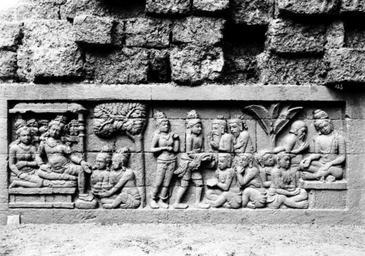 Keywords: COLLECTIE TROPENMUSEUM Reliëf O 26 op de verborgen voet van de Borobudur TMnr 10015764.jpg nl Negatief Negatief waarop reliëf O 26 van de verborgen voet van de Borobudur te zien is De verborgen voet van de Borobudur is de oorspronkelijke basis van het Buddhistische heiligdom dat rond 800 gebouwd is In een latere fase van de bouw werd deze basis verborgen waarschijnlijk om verzakking te verkomen De verborgen voet loopt om het hele bouwwerk heen en bevat 160 reliëfs die tezamen de Mahakarmawibhangga verbeelden een Mahayanistische tekst die de werking van de leer van Karma uiteenzet Deze leerrede wordt aan Buddha toegeschreven en handelt over oorzaak en gevolg N J Krom en Th van Erp duiden in hun standaardwerk over de Borobudur Beschrijving van Barabudur Den Haag Martinus Nijhoff 1920-1931 de reliëfs van de verborgen voet aan als serie O Op de reliëfs zijn voorbeelden van de theorie uitgebeeld goede daden hebben goede gevolgen en slechte daden hebben slechte gevolgen De reliëfs vallen in twee delen uiteen O 1 tot en met O 117 verbeelden een aantal daden die leiden tot één en hetzelfde gevolg De reliëfs O 118 tot en met O 160 tonen verschillende gevolgen van één oorzaak De uiteenzetting van de leer begint bij de trap aan de oostzijde en ontrolt zich met de klok mee om het bouwwerk heen De reliëfs moeten dan ook gelezen worden van rechts naar links Lange tijd was onbekend wat op de reliëfs van de verborgen voet stond afgebeeld Hoewel de reliëfs al in 1885 waren ontdekt door Dr Ir J W IJzerman 1851-1932 kon de Franse geleerde Sylvain Lévi pas in 1929 op het zesde Congres van het Oostersch Genootschap constateren dat het op de verborgen voet ging om een Buddhistische tekst Mahakarmawibhangga Lévi had in 1922 een manuscript uit 1411 met deze tekst ontdekt in Kathmandu Nepal De tekst bleek populair in de Burdhistische wereld te zijn en een aantal verwante teksten te hebben twee Chinese werken waarvan één vertaald was in 582 door Gautama Dharmaprajna en één tussen 980 en 1000 door T'ien si Tsai Daarnaast bevat de Tibetaanse Kanjur twee werken met de titel Karmawibhangga In 1933 publiceerde de archeoloog N J Krom een uitgebreide analyse van het Mahakarmawibhangga op de reliëfs van de bedolven voet Hierin legt hij een relatie tussen de afbeeldingen op de reliëfs en de tekstpassages in het Mahakarmawibhangga Reliëf O 26 bevindt zich aan de zuidzijde van de Borobudur en correspondeert volgens N J Krom met de zesde paragraaf van het Mahakarmawibhangga Wat is de daad die bevalligheid ten gevolge heeft Antwoord afwezigheid van toorn; afwezigheid van haatdragendheid; afwezigheid van geveinsdheid; het schenken van kleden; het geven van stuco voor stupa's en caitya-monumenten; het geven van gouden vaatwerk het geven van welriekende pleister; het geven van versierselen; het prijzen van vader en moeder; het prijzen van edele deugdzame lieden; het schoonvegen van stupahoven en kloosters; het voortdurend schoonvegen van caitya- monumenten; het niet uitlachen van wanstaltige wezens en ook van anderen kinderen en grijsaards; desgelijks een behoorlijk gedrag Zoals Dat is de daad die bevalligheid ten gevolge heeft Uit N J Krom Het Karmawibhangga op Barabudur Mededeelingen der koninklijke academie van wetenschappen afdeeling letterkunde deel 76 serie B No 8 Amsterdam Noordhollandsche Uitgevers-Maatschappij 1933 223 Deze paragraaf heeft betrekking op reliëfs O 26 tot en met O 33 Op de linkertaferelen is gratie bevalligheid uitgebeeld door middel van een aanzienlijke man met zijn gezin en personeel; het gevolg van hetgeen op het rechtergedeelte is te zien Onduidelijk is wat het gesprek betekent dat op 26a staat afgebeeld Op 26b worden kleden geschonken Bronnen A J Bernet Kempers Borobudur Mysteriegebeuren in steen Verval en restauratie Oudjavaans volksleven Wassenaar 1973/gewijzigde herdruk ; Van Erp Th Krom N J Beschrijving van Barabudur Den Haag Martinus Nijhoff 1920-1931 ; N J Krom Het Karmawibhangga op Barabudur Mededeelingen der koninklijke academie van wetenschappen afdeeling letterkunde deel 76 serie B No 8 Amsterdam Noordhollandsche Uitgevers-Maatschappij 1933 Reliëf O 26 op de verborgen voet van de Borobudur 1890-1891 institution Tropenmuseum KIT-source 10015764 Creator Kassian Cephas KIT-license PD-old-100 Photographs by Kassian Cephas Tropenmuseum Borobudur reliefs Borobudur in 1890 Black and white photographs |