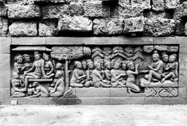 Keywords: COLLECTIE TROPENMUSEUM Reliëf O 28 op de verborgen voet van de Borobudur TMnr 10015766.jpg nl Negatief Negatief waarop reliëf O 28 van de verborgen voet van de Borobudur te zien is De verborgen voet van de Borobudur is de oorspronkelijke basis van het Buddhistische heiligdom dat rond 800 gebouwd is In een latere fase van de bouw werd deze basis verborgen waarschijnlijk om verzakking te verkomen De verborgen voet loopt om het hele bouwwerk heen en bevat 160 reliëfs die tezamen de Mahakarmawibhangga verbeelden een Mahayanistische tekst die de werking van de leer van Karma uiteenzet Deze leerrede wordt aan Buddha toegeschreven en handelt over oorzaak en gevolg N J Krom en Th van Erp duiden in hun standaardwerk over de Borobudur Beschrijving van Barabudur Den Haag Martinus Nijhoff 1920-1931 de reliëfs van de verborgen voet aan als serie O Op de reliëfs zijn voorbeelden van de theorie uitgebeeld goede daden hebben goede gevolgen en slechte daden hebben slechte gevolgen De reliëfs vallen in twee delen uiteen O 1 tot en met O 117 verbeelden een aantal daden die leiden tot één en hetzelfde gevolg De reliëfs O 118 tot en met O 160 tonen verschillende gevolgen van één oorzaak De uiteenzetting van de leer begint bij de trap aan de oostzijde en ontrolt zich met de klok mee om het bouwwerk heen De reliëfs moeten dan ook gelezen worden van rechts naar links Lange tijd was onbekend wat op de reliëfs van de verborgen voet stond afgebeeld Hoewel de reliëfs al in 1885 waren ontdekt door Dr Ir J W IJzerman 1851-1932 kon de Franse geleerde Sylvain Lévi pas in 1929 op het zesde Congres van het Oostersch Genootschap constateren dat het op de verborgen voet ging om een Buddhistische tekst Mahakarmawibhangga Lévi had in 1922 een manuscript uit 1411 met deze tekst ontdekt in Kathmandu Nepal De tekst bleek populair in de Burdhistische wereld te zijn en een aantal verwante teksten te hebben twee Chinese werken waarvan één vertaald was in 582 door Gautama Dharmaprajna en één tussen 980 en 1000 door T'ien si Tsai Daarnaast bevat de Tibetaanse Kanjur twee werken met de titel Karmawibhangga In 1933 publiceerde de archeoloog N J Krom een uitgebreide analyse van het Mahakarmawibhangga op de reliëfs van de bedolven voet Hierin legt hij een relatie tussen de afbeeldingen op de reliëfs en de tekstpassages in het Mahakarmawibhangga Reliëf O 28 bevindt zich aan de zuidzijde van de Borobudur en correspondeert volgens N J Krom met de zesde paragraaf van het Mahakarmawibhangga Wat is de daad die bevalligheid ten gevolge heeft Antwoord afwezigheid van toorn; afwezigheid van haatdragendheid; afwezigheid van geveinsdheid; het schenken van kleden; het geven van stuco voor stupa's en caitya-monumenten; het geven van gouden vaatwerk het geven van welriekende pleister; het geven van versierselen; het prijzen van vader en moeder; het prijzen van edele deugdzame lieden; het schoonvegen van stupahoven en kloosters; het voortdurend schoonvegen van caitya- monumenten; het niet uitlachen van wanstaltige wezens en ook van anderen kinderen en grijsaards; desgelijks een behoorlijk gedrag Zoals Dat is de daad die bevalligheid ten gevolge heeft Uit N J Krom Het Karmawibhangga op Barabudur Mededeelingen der koninklijke academie van wetenschappen afdeeling letterkunde deel 76 serie B No 8 Amsterdam Noordhollandsche Uitgevers-Maatschappij 1933 223 Deze paragraaf heeft betrekking op reliëfs O 26 tot en met O 33 Op de linkertaferelen is gratie bevalligheid uitgebeeld door middel van een aanzienlijke man met zijn gezin en personeel; het gevolg van hetgeen op het rechtergedeelte is te zien Op 28a krijgen een aantal asceten edele en deugdzame lieden een eerbiedsbetuiging Bronnen A J Bernet Kempers Borobudur Mysteriegebeuren in steen Verval en restauratie Oudjavaans volksleven Wassenaar 1973/gewijzigde herdruk ; Van Erp Th Krom N J Beschrijving van Barabudur Den Haag Martinus Nijhoff 1920-1931 ; N J Krom Het Karmawibhangga op Barabudur Mededeelingen der koninklijke academie van wetenschappen afdeeling letterkunde deel 76 serie B No 8 Amsterdam Noordhollandsche Uitgevers-Maatschappij 1933 Reliëf O 28 op de verborgen voet van de Borobudur 1890-1891 institution Tropenmuseum KIT-source 10015766 Creator Kassian Cephas KIT-license PD-old-100 Tropenmuseum Borobudur reliefs Photographs by Kassian Cephas Borobudur in 1890 Black and white photographs |
