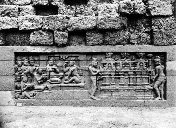 Keywords: COLLECTIE TROPENMUSEUM Reliëf O 29 op de verborgen voet van de Borobudur TMnr 10015767.jpg nl Negatief Negatief waarop reliëf O 29 van de verborgen voet van de Borobudur te zien is De verborgen voet van de Borobudur is de oorspronkelijke basis van het Buddhistische heiligdom dat rond 800 gebouwd is In een latere fase van de bouw werd deze basis verborgen waarschijnlijk om verzakking te verkomen De verborgen voet loopt om het hele bouwwerk heen en bevat 160 reliëfs die tezamen de Mahakarmawibhangga verbeelden een Mahayanistische tekst die de werking van de leer van Karma uiteenzet Deze leerrede wordt aan Buddha toegeschreven en handelt over oorzaak en gevolg N J Krom en Th van Erp duiden in hun standaardwerk over de Borobudur Beschrijving van Barabudur Den Haag Martinus Nijhoff 1920-1931 de reliëfs van de verborgen voet aan als serie O Op de reliëfs zijn voorbeelden van de theorie uitgebeeld goede daden hebben goede gevolgen en slechte daden hebben slechte gevolgen De reliëfs vallen in twee delen uiteen O 1 tot en met O 117 verbeelden een aantal daden die leiden tot één en hetzelfde gevolg De reliëfs O 118 tot en met O 160 tonen verschillende gevolgen van één oorzaak De uiteenzetting van de leer begint bij de trap aan de oostzijde en ontrolt zich met de klok mee om het bouwwerk heen De reliëfs moeten dan ook gelezen worden van rechts naar links Lange tijd was onbekend wat op de reliëfs van de verborgen voet stond afgebeeld Hoewel de reliëfs al in 1885 waren ontdekt door Dr Ir J W IJzerman 1851-1932 kon de Franse geleerde Sylvain Lévi pas in 1929 op het zesde Congres van het Oostersch Genootschap constateren dat het op de verborgen voet ging om een Buddhistische tekst Mahakarmawibhangga Lévi had in 1922 een manuscript uit 1411 met deze tekst ontdekt in Kathmandu Nepal De tekst bleek populair in de Burdhistische wereld te zijn en een aantal verwante teksten te hebben twee Chinese werken waarvan één vertaald was in 582 door Gautama Dharmaprajna en één tussen 980 en 1000 door T'ien si Tsai Daarnaast bevat de Tibetaanse Kanjur twee werken met de titel Karmawibhangga In 1933 publiceerde de archeoloog N J Krom een uitgebreide analyse van het Mahakarmawibhangga op de reliëfs van de bedolven voet Hierin legt hij een relatie tussen de afbeeldingen op de reliëfs en de tekstpassages in het Mahakarmawibhangga Reliëf O 29 bevindt zich aan de zuidzijde van de Borobudur en correspondeert volgens N J Krom met de zesde paragraaf van het Mahakarmawibhangga Wat is de daad die bevalligheid ten gevolge heeft Antwoord afwezigheid van toorn; afwezigheid van haatdragendheid; afwezigheid van geveinsdheid; het schenken van kleden; het geven van stuco voor stupa's en caitya-monumenten; het geven van gouden vaatwerk het geven van welriekende pleister; het geven van versierselen; het prijzen van vader en moeder; het prijzen van edele deugdzame lieden; het schoonvegen van stupahoven en kloosters; het voortdurend schoonvegen van caitya- monumenten; het niet uitlachen van wanstaltige wezens en ook van anderen kinderen en grijsaards; desgelijks een behoorlijk gedrag Zoals Dat is de daad die bevalligheid ten gevolge heeft Uit N J Krom Het Karmawibhangga op Barabudur Mededeelingen der koninklijke academie van wetenschappen afdeeling letterkunde deel 76 serie B No 8 Amsterdam Noordhollandsche Uitgevers-Maatschappij 1933 223 Deze paragraaf heeft betrekking op reliëfs O 26 tot en met O 33 Op de linkertaferelen is gratie bevalligheid uitgebeeld door middel van een aanzienlijke man met zijn gezin en personeel; het gevolg van hetgeen op het rechtergedeelte is te zien De reliëfs O 29 tot en met O 31 tonen hulde aan heiligdommen waarbij de beeldhouwer niet het schoonvegen en de stupa volgt maar wel drie soorten gebouwen afbeeldt Op 29a wordt een heiligdom eer bewezen door middel van wijwater en bloemen Bronnen A J Bernet Kempers Borobudur Mysteriegebeuren in steen Verval en restauratie Oudjavaans volksleven Wassenaar 1973/gewijzigde herdruk ; Van Erp Th Krom N J Beschrijving van Barabudur Den Haag Martinus Nijhoff 1920-1931 ; N J Krom Het Karmawibhangga op Barabudur Mededeelingen der koninklijke academie van wetenschappen afdeeling letterkunde deel 76 serie B No 8 Amsterdam Noordhollandsche Uitgevers-Maatschappij 1933 Reliëf O 29 op de verborgen voet van de Borobudur 1890-1891 institution Tropenmuseum KIT-source 10015767 Creator Kassian Cephas KIT-license PD-old-100 Photographs by Kassian Cephas Tropenmuseum Borobudur reliefs Borobudur in 1890 Black and white photographs |