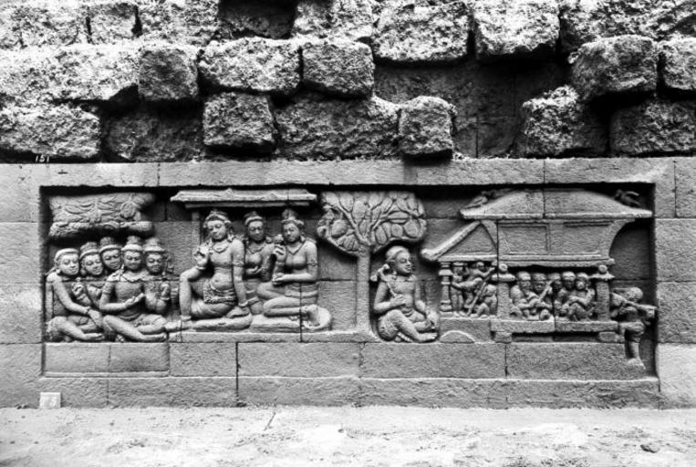 Keywords: COLLECTIE TROPENMUSEUM Reliëf O 30 op de verborgen voet van de Borobudur TMnr 10015768.jpg nl Negatief Negatief waarop reliëf O 30 van de verborgen voet van de Borobudur te zien is De verborgen voet van de Borobudur is de oorspronkelijke basis van het Buddhistische heiligdom dat rond 800 gebouwd is In een latere fase van de bouw werd deze basis verborgen waarschijnlijk om verzakking te verkomen De verborgen voet loopt om het hele bouwwerk heen en bevat 160 reliëfs die tezamen de Mahakarmawibhangga verbeelden een Mahayanistische tekst die de werking van de leer van Karma uiteenzet Deze leerrede wordt aan Buddha toegeschreven en handelt over oorzaak en gevolg N J Krom en Th van Erp duiden in hun standaardwerk over de Borobudur Beschrijving van Barabudur Den Haag Martinus Nijhoff 1920-1931 de reliëfs van de verborgen voet aan als serie O Op de reliëfs zijn voorbeelden van de theorie uitgebeeld goede daden hebben goede gevolgen en slechte daden hebben slechte gevolgen De reliëfs vallen in twee delen uiteen O 1 tot en met O 117 verbeelden een aantal daden die leiden tot één en hetzelfde gevolg De reliëfs O 118 tot en met O 160 tonen verschillende gevolgen van één oorzaak De uiteenzetting van de leer begint bij de trap aan de oostzijde en ontrolt zich met de klok mee om het bouwwerk heen De reliëfs moeten dan ook gelezen worden van rechts naar links Lange tijd was onbekend wat op de reliëfs van de verborgen voet stond afgebeeld Hoewel de reliëfs al in 1885 waren ontdekt door Dr Ir J W IJzerman 1851-1932 kon de Franse geleerde Sylvain Lévi pas in 1929 op het zesde Congres van het Oostersch Genootschap constateren dat het op de verborgen voet ging om een Buddhistische tekst Mahakarmawibhangga Lévi had in 1922 een manuscript uit 1411 met deze tekst ontdekt in Kathmandu Nepal De tekst bleek populair in de Burdhistische wereld te zijn en een aantal verwante teksten te hebben twee Chinese werken waarvan één vertaald was in 582 door Gautama Dharmaprajna en één tussen 980 en 1000 door T'ien si Tsai Daarnaast bevat de Tibetaanse Kanjur twee werken met de titel Karmawibhangga In 1933 publiceerde de archeoloog N J Krom een uitgebreide analyse van het Mahakarmawibhangga op de reliëfs van de bedolven voet Hierin legt hij een relatie tussen de afbeeldingen op de reliëfs en de tekstpassages in het Mahakarmawibhangga Reliëf O 30 bevindt zich aan de zuidzijde van de Borobudur en correspondeert volgens N J Krom met de zesde paragraaf van het Mahakarmawibhangga Wat is de daad die bevalligheid ten gevolge heeft Antwoord afwezigheid van toorn; afwezigheid van haatdragendheid; afwezigheid van geveinsdheid; het schenken van kleden; het geven van stuco voor stupa's en caitya-monumenten; het geven van gouden vaatwerk het geven van welriekende pleister; het geven van versierselen; het prijzen van vader en moeder; het prijzen van edele deugdzame lieden; het schoonvegen van stupahoven en kloosters; het voortdurend schoonvegen van caitya- monumenten; het niet uitlachen van wanstaltige wezens en ook van anderen kinderen en grijsaards; desgelijks een behoorlijk gedrag Zoals Dat is de daad die bevalligheid ten gevolge heeft Uit N J Krom Het Karmawibhangga op Barabudur Mededeelingen der koninklijke academie van wetenschappen afdeeling letterkunde deel 76 serie B No 8 Amsterdam Noordhollandsche Uitgevers-Maatschappij 1933 223 Deze paragraaf heeft betrekking op reliëfs O 26 tot en met O 33 Op de linkertaferelen is gratie bevalligheid uitgebeeld door middel van een aanzienlijke man met zijn gezin en personeel; het gevolg van hetgeen op het rechtergedeelte is te zien De reliëfs O 29 tot en met O 31 tonen hulde aan heiligdommen waarbij de beeldhouwer niet het schoonvegen en de stupa volgt maar wel drie soorten gebouwen afbeeldt Op 30a staat een bouw of restauratie van een klooster afgebeeld wat geïllustreerd wordt door het aandragen van materiaal en de aanwezigheid van een timmerman Bronnen A J Bernet Kempers Borobudur Mysteriegebeuren in steen Verval en restauratie Oudjavaans volksleven Wassenaar 1973/gewijzigde herdruk ; Van Erp Th Krom N J Beschrijving van Barabudur Den Haag Martinus Nijhoff 1920-1931 ; N J Krom Het Karmawibhangga op Barabudur Mededeelingen der koninklijke academie van wetenschappen afdeeling letterkunde deel 76 serie B No 8 Amsterdam Noordhollandsche Uitgevers-Maatschappij 1933 Reliëf O 30 op de verborgen voet van de Borobudur 1890-1891 institution Tropenmuseum KIT-source 10015768 Creator Kassian Cephas KIT-license PD-old-100 Photographs by Kassian Cephas Tropenmuseum Borobudur reliefs Borobudur in 1890 Black and white photographs |