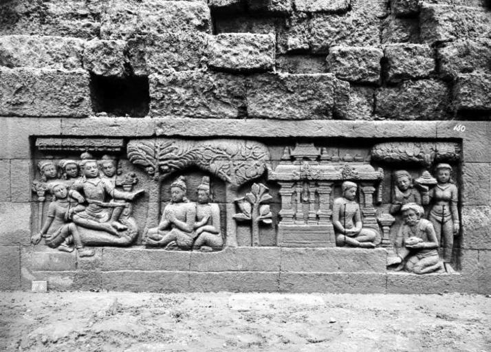 Keywords: COLLECTIE TROPENMUSEUM Reliëf O 31 op de verborgen voet van de Borobudur TMnr 10015769.jpg nl Negatief Negatief waarop reliëf O 31 van de verborgen voet van de Borobudur te zien is De verborgen voet van de Borobudur is de oorspronkelijke basis van het Buddhistische heiligdom dat rond 800 gebouwd is In een latere fase van de bouw werd deze basis verborgen waarschijnlijk om verzakking te verkomen De verborgen voet loopt om het hele bouwwerk heen en bevat 160 reliëfs die tezamen de Mahakarmawibhangga verbeelden een Mahayanistische tekst die de werking van de leer van Karma uiteenzet Deze leerrede wordt aan Buddha toegeschreven en handelt over oorzaak en gevolg N J Krom en Th van Erp duiden in hun standaardwerk over de Borobudur Beschrijving van Barabudur Den Haag Martinus Nijhoff 1920-1931 de reliëfs van de verborgen voet aan als serie O Op de reliëfs zijn voorbeelden van de theorie uitgebeeld goede daden hebben goede gevolgen en slechte daden hebben slechte gevolgen De reliëfs vallen in twee delen uiteen O 1 tot en met O 117 verbeelden een aantal daden die leiden tot één en hetzelfde gevolg De reliëfs O 118 tot en met O 160 tonen verschillende gevolgen van één oorzaak De uiteenzetting van de leer begint bij de trap aan de oostzijde en ontrolt zich met de klok mee om het bouwwerk heen De reliëfs moeten dan ook gelezen worden van rechts naar links Lange tijd was onbekend wat op de reliëfs van de verborgen voet stond afgebeeld Hoewel de reliëfs al in 1885 waren ontdekt door Dr Ir J W IJzerman 1851-1932 kon de Franse geleerde Sylvain Lévi pas in 1929 op het zesde Congres van het Oostersch Genootschap constateren dat het op de verborgen voet ging om een Buddhistische tekst Mahakarmawibhangga Lévi had in 1922 een manuscript uit 1411 met deze tekst ontdekt in Kathmandu Nepal De tekst bleek populair in de Burdhistische wereld te zijn en een aantal verwante teksten te hebben twee Chinese werken waarvan één vertaald was in 582 door Gautama Dharmaprajna en één tussen 980 en 1000 door T'ien si Tsai Daarnaast bevat de Tibetaanse Kanjur twee werken met de titel Karmawibhangga In 1933 publiceerde de archeoloog N J Krom een uitgebreide analyse van het Mahakarmawibhangga op de reliëfs van de bedolven voet Hierin legt hij een relatie tussen de afbeeldingen op de reliëfs en de tekstpassages in het Mahakarmawibhangga Reliëf O 31 bevindt zich aan de zuidzijde van de Borobudur en correspondeert volgens N J Krom met de zesde paragraaf van het Mahakarmawibhangga Wat is de daad die bevalligheid ten gevolge heeft Antwoord afwezigheid van toorn; afwezigheid van haatdragendheid; afwezigheid van geveinsdheid; het schenken van kleden; het geven van stuco voor stupa's en caitya-monumenten; het geven van gouden vaatwerk het geven van welriekende pleister; het geven van versierselen; het prijzen van vader en moeder; het prijzen van edele deugdzame lieden; het schoonvegen van stupahoven en kloosters; het voortdurend schoonvegen van caitya- monumenten; het niet uitlachen van wanstaltige wezens en ook van anderen kinderen en grijsaards; desgelijks een behoorlijk gedrag Zoals Dat is de daad die bevalligheid ten gevolge heeft Uit N J Krom Het Karmawibhangga op Barabudur Mededeelingen der koninklijke academie van wetenschappen afdeeling letterkunde deel 76 serie B No 8 Amsterdam Noordhollandsche Uitgevers-Maatschappij 1933 223 Deze paragraaf heeft betrekking op reliëfs O 26 tot en met O 33 Op de linkertaferelen is gratie bevalligheid uitgebeeld door middel van een aanzienlijke man met zijn gezin en personeel; het gevolg van hetgeen op het rechtergedeelte is te zien De reliëfs O 29 tot en met O 31 tonen hulde aan heiligdommen waarbij de beeldhouwer niet het schoonvegen en de stupa volgt maar wel drie soorten gebouwen afbeeldt Reliëf 31a toont een huldebetuiging aan een monument; in de deur zit een monnik Bronnen A J Bernet Kempers Borobudur Mysteriegebeuren in steen Verval en restauratie Oudjavaans volksleven Wassenaar 1973/gewijzigde herdruk ; Van Erp Th Krom N J Beschrijving van Barabudur Den Haag Martinus Nijhoff 1920-1931 ; N J Krom Het Karmawibhangga op Barabudur Mededeelingen der koninklijke academie van wetenschappen afdeeling letterkunde deel 76 serie B No 8 Amsterdam Noordhollandsche Uitgevers-Maatschappij 1933 Reliëf O 31 op de verborgen voet van de Borobudur 1890-1891 institution Tropenmuseum KIT-source 10015769 Creator Kassian Cephas KIT-license PD-old-100 Photographs by Kassian Cephas Tropenmuseum Borobudur reliefs Borobudur in 1890 Black and white photographs |