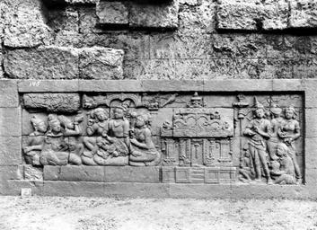 Keywords: COLLECTIE TROPENMUSEUM Reliëf O 33 op de verborgen voet van de Borobudur TMnr 10015771.jpg nl Negatief Negatief waarop reliëf O 33 van de verborgen voet van de Borobudur te zien is De verborgen voet van de Borobudur is de oorspronkelijke basis van het Buddhistische heiligdom dat rond 800 gebouwd is In een latere fase van de bouw werd deze basis verborgen waarschijnlijk om verzakking te verkomen De verborgen voet loopt om het hele bouwwerk heen en bevat 160 reliëfs die tezamen de Mahakarmawibhangga verbeelden een Mahayanistische tekst die de werking van de leer van Karma uiteenzet Deze leerrede wordt aan Buddha toegeschreven en handelt over oorzaak en gevolg N J Krom en Th van Erp duiden in hun standaardwerk over de Borobudur Beschrijving van Barabudur Den Haag Martinus Nijhoff 1920-1931 de reliëfs van de verborgen voet aan als serie O Op de reliëfs zijn voorbeelden van de theorie uitgebeeld goede daden hebben goede gevolgen en slechte daden hebben slechte gevolgen De reliëfs vallen in twee delen uiteen O 1 tot en met O 117 verbeelden een aantal daden die leiden tot één en hetzelfde gevolg De reliëfs O 118 tot en met O 160 tonen verschillende gevolgen van één oorzaak De uiteenzetting van de leer begint bij de trap aan de oostzijde en ontrolt zich met de klok mee om het bouwwerk heen De reliëfs moeten dan ook gelezen worden van rechts naar links Lange tijd was onbekend wat op de reliëfs van de verborgen voet stond afgebeeld Hoewel de reliëfs al in 1885 waren ontdekt door Dr Ir J W IJzerman 1851-1932 kon de Franse geleerde Sylvain Lévi pas in 1929 op het zesde Congres van het Oostersch Genootschap constateren dat het op de verborgen voet ging om een Buddhistische tekst Mahakarmawibhangga Lévi had in 1922 een manuscript uit 1411 met deze tekst ontdekt in Kathmandu Nepal De tekst bleek populair in de Burdhistische wereld te zijn en een aantal verwante teksten te hebben twee Chinese werken waarvan één vertaald was in 582 door Gautama Dharmaprajna en één tussen 980 en 1000 door T'ien si Tsai Daarnaast bevat de Tibetaanse Kanjur twee werken met de titel Karmawibhangga In 1933 publiceerde de archeoloog N J Krom een uitgebreide analyse van het Mahakarmawibhangga op de reliëfs van de bedolven voet Hierin legt hij een relatie tussen de afbeeldingen op de reliëfs en de tekstpassages in het Mahakarmawibhangga Reliëf O 33 bevindt zich aan de zuidzijde van de Borobudur en correspondeert volgens N J Krom met de zesde paragraaf van het Mahakarmawibhangga Wat is de daad die bevalligheid ten gevolge heeft Antwoord afwezigheid van toorn; afwezigheid van haatdragendheid; afwezigheid van geveinsdheid; het schenken van kleden; het geven van stuco voor stupa's en caitya-monumenten; het geven van gouden vaatwerk het geven van welriekende pleister; het geven van versierselen; het prijzen van vader en moeder; het prijzen van edele deugdzame lieden; het schoonvegen van stupahoven en kloosters; het voortdurend schoonvegen van caitya- monumenten; het niet uitlachen van wanstaltige wezens en ook van anderen kinderen en grijsaards; desgelijks een behoorlijk gedrag Zoals Dat is de daad die bevalligheid ten gevolge heeft Uit N J Krom Het Karmawibhangga op Barabudur Mededeelingen der koninklijke academie van wetenschappen afdeeling letterkunde deel 76 serie B No 8 Amsterdam Noordhollandsche Uitgevers-Maatschappij 1933 223 Deze paragraaf heeft betrekking op reliëfs O 26 tot en met O 33 Op de linkertaferelen is gratie bevalligheid uitgebeeld door middel van een aanzienlijke man met zijn gezin en personeel; het gevolg van hetgeen op het rechtergedeelte is te zien 32b toont een aanzienlijk gezelschap wat een huldebetuiging aan een heiligdom verbeeldt Bronnen A J Bernet Kempers Borobudur Mysteriegebeuren in steen Verval en restauratie Oudjavaans volksleven Wassenaar 1973/gewijzigde herdruk ; Van Erp Th Krom N J Beschrijving van Barabudur Den Haag Martinus Nijhoff 1920-1931 ; N J Krom Het Karmawibhangga op Barabudur Mededeelingen der koninklijke academie van wetenschappen afdeeling letterkunde deel 76 serie B No 8 Amsterdam Noordhollandsche Uitgevers-Maatschappij 1933 Reliëf O 33 op de verborgen voet van de Borobudur 1890-1891 institution Tropenmuseum KIT-source 10015771 Creator Kassian Cephas KIT-license PD-old-100 Photographs by Kassian Cephas Tropenmuseum Borobudur reliefs Borobudur in 1890 Black and white photographs |
