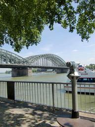 Keywords: cologne bridge rhine hohenzollern bridge dom cologne cathedral river rheinland historic preservation spires metal rods metal arch church steeples aerial view railway bridge train railway telescope