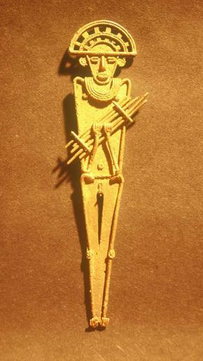 | Keywords: Colombian - Standing Man with Miniature Raft - Walters 572289.jpg The earliest evidence of goldworking in the Western Hemisphere dates to around 2000 BC when gold was first hammered into thin foil sheets in ancient Peru But it was the goldsmiths of Colombia who had access to the largest veins of gold ore which they extracted by placer mining panning and by building simple vertical shaft mines Gold was melted and worked in a variety of techniques including hammering often around a wooden form and lost-wax casting in which a wax model of an object is made and encased in clay which is fired causing the wax to melt and run out through a hole; molten gold is then poured into the hole and hardens and the resulting figure is revealed when the clay mold is broken apart Much ancient American gold is naturally alloyed or mixed with copper with percentages of copper rising to as high as 70 percent This material called tumbaga often has a reddish color Ancient Colombian metalworkers developed depletion gilding techniques in which the copper was removed from the gold using organic acids The most famous Muisca artifacts are tunjos human images cast using the lost-wax technique and left much rougher in surface texture than most ancient Colombian gold The knowledge of goldworking spread from the central and northern Andes into Central America and gradually a blend of techniques and imagery developed into what is known as the International Style Very little of this material survived the Spanish conquest between 1000 1500 Late Intermediate gold cm 15 3 4 4 accession number 57 2289 15663 Rebecca Herrero Stokes date and mode of acquisition unknown Walters Art Museum Gift of Rebecca Herrero Stokes 2003 Art of the Ancient Americas The Walters Art Museum Baltimore 2002-2010 place of origin Colombia Walters Art Museum license Pre-Columbian art in the Walters Art Museum Art of Colombia Gold sculptures Figurines Tumbaga |