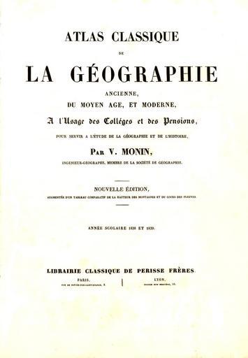 Keywords: Colophon atlas classique g monin.jpg en Title page of Monin ™s Atlas classique it Colophon Atlante di Geografia Antica medievale e moderna V Monin Atlas classique de la GĂ©ographie ancienne du moyen age et moderne Nouvelle Ă©dition Paris/Lyon Perisse 1838 Charles V Monin ca 1838 PD-old-100 Charles V Monin Title pages from France Title pages in French 1830s books Title pages of atlases |