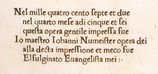 Keywords: Colophon de Numeister de la première édition de la divine comédie de Dante.jpg fr Colophon-Numeister-Dante 11 avril 1472 http //www italnet nd edu/Dante/images/tp1472/1472-col jpeg Colophon détail Jean Numeister 1472 other versions Custom license marker 2016 10 21 PD-old-100-1923 Johannes Numeister Incunabula in lingua italiana The Divine Comedy |