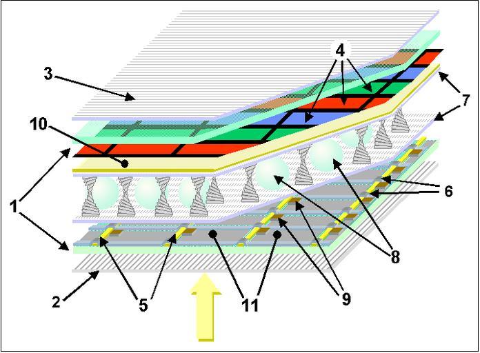 Keywords: Color TFT-LCD Layout.png EN Schematic layout of a TFT-LCD display<br /> DE Schematischer Aufbau eines TFT-LCD-Bildschirms 1 EN Glass plates FR Plaques de verre DE Glasplatten ES Placas de vidrio 2+3 EN Horizontal and vertical polarisers FR Filtres polarisant vertical et horizontal DE Horizontale und Vertikale Polarisationsfilter ES Polarizadores horizontal y vertical 4 EN RGB colour mask FR Masque de couleur RVB DE RGB-Farbmaske ES Máscara de color RGB 5+6 EN Horizontal and vertical command lines FR Lignes de commande horizontales et verticales DE Horizontale und Vertikale Ansprechreihen ES Líneas de control horizontales y verticales 7 EN Rugged polymer layer FR Couche de polymère rayée DE Stabile Polymerschicht ES Capa de polímero 8 EN Spacers FR Billes d'espacement DE Abstandshalter ES Separadores 9 EN Thin film transistors FR Transistors en film mince DE Dünnschichttransistoren ES Transistores TFT 10 EN front electrode FR Electrode avant DE Frontelektrode ES Electrodo frontal 11 EN rear electrodes FR Electrodes arrières DE Hintere Elektroden ES Electrodos traseros schematic drawings of LCDs TFT schemas |