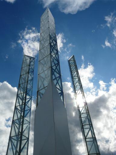 Keywords: columnar artwork steles sky clouds architecture modern art abstract high up towering