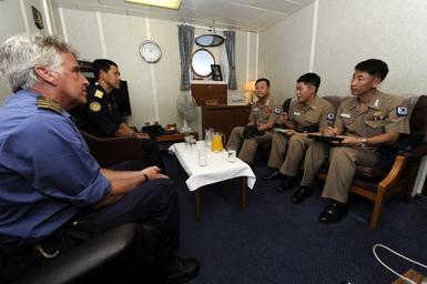 Keywords: Combined Task Force 151 120416-N-AZ513-050.jpg en Royal Fleet Auxiliary British Capt Ian Pilling left and Royal Thai Navy Rear Adm Tanin Likitawong meet with Republic of Korea Navy Capt Kim Eun Soo aboard the Royal Fleet Auxiliary Fort Victoria A387 Fort Victoria is assigned to Combined Task Force 151 a multinational mission-based task force working under the Combined Maritime Forces to conduct counterpiracy operation in the Red Sea Gulf of Oman Somali Basin and Arabian Sea 2012-04-16 Petty Officer 3rd Class John Callahan https //www dvidshub net/image/574924 120416-N-AZ513-050 2012-05-08 05 54 ARABIAN SEA USAFRICOM AT SEA PD-USGov-Military-Navy Combined Task Force 151 Images from DoD uploaded by Fæ
