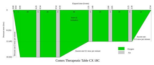 Keywords: Comex CX 18C Table.svg en Graphic representation of the Comex Therapeutic Table CX 18C 2016-04-01 own Peter Southwood other versions cc-zero Decompression tables