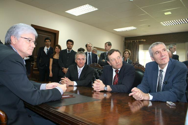 Keywords: people indoor Empresários franceses visitaram nesta quinta-feira (10) o presidente da Assembleia Legislativa do Paraná, Valdir Rossoni (PSDB). A comitiva da empresa Limagrain está no estado para concretizar uma parceria com a Sementes Guerra S/A, do empresário Luiz Fernando Guerra. Rossoni ressaltou a importância desta parceria para o Paraná e principalmente para a região sudoeste. “Tenho a certeza de que essa parceria irá prosperar. Somos parceiros políticos da família Guerra, que goza de grande prestígio no estado. Coloco o Poder Legislativo à disposição para que a união das duas empresas alcance os seus anseios”, disse o presidente. “Essa junção proporciona ao estado um momento histórico que trará grandes benefícios para o novo Paraná”, completou Rossoni. O diretor geral da empresa francesa, Daniel Chéron, destacou que o principal papel da Limagrain é o de colocar as melhores sementes no mercado que atua. Além da Europa, a Limagrain opera também nos Estados Unidos, China, Índia e Japão. “No Brasil temos a intenção de construir um grande pólo de culturas. O país se tornou importante para a nossa Companhia por ser o terceiro maior produtor de milho”, relatou Chéron. Essa foi a primeira comitiva internacional recebida pelo presidente Valdir Rossoni, que assumiu a Assembleia no último dia 1º. Além dos empresários franceses, a comitiva era composta por profissionais de mídia, dos jornais Le Figaro e Le Monde (França) e Zero Hora, além das revistas Isto É Dinheiro Rural e Seed News e da TV Itapuã de Pato Branco. Foto: Maria de Freitas / Assembleia Legislativa do Paraná Empresários franceses visitaram nesta quinta-feira (10) o presidente da Assembleia Legislativa do Paraná, Valdir Rossoni (PSDB). A comitiva da empresa Limagrain está no estado para concretizar uma parceria com a Sementes Guerra S/A, do empresário Luiz Fernando Guerra. Rossoni ressaltou a importância desta parceria para o Paraná e principalmente para a região sudoeste. “Tenho a certeza de que essa parceria irá prosperar. Somos parceiros políticos da família Guerra, que goza de grande prestígio no estado. Coloco o Poder Legislativo à disposição para que a união das duas empresas alcance os seus anseios”, disse o presidente. “Essa junção proporciona ao estado um momento histórico que trará grandes benefícios para o novo Paraná”, completou Rossoni. O diretor geral da empresa francesa, Daniel Chéron, destacou que o principal papel da Limagrain é o de colocar as melhores sementes no mercado que atua. Além da Europa, a Limagrain opera também nos Estados Unidos, China, Índia e Japão. “No Brasil temos a intenção de construir um grande pólo de culturas. O país se tornou importante para a nossa Companhia por ser o terceiro maior produtor de milho”, relatou Chéron. Essa foi a primeira comitiva internacional recebida pelo presidente Valdir Rossoni, que assumiu a Assembleia no último dia 1º. Além dos empresários franceses, a comitiva era composta por profissionais de mídia, dos jornais Le Figaro e Le Monde (França) e Zero Hora, além das revistas Isto É Dinheiro Rural e Seed News e da TV Itapuã de Pato Branco. Foto: Maria de Freitas / Assembleia Legislativa do Paraná |