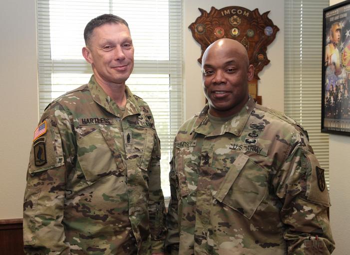 | Keywords: people groupshot Command Sgt. Maj. Jeffrey Hartless, of U.S. Army Installation Management Command, meets Command Sgt. Maj. Brian Lindsey, of Fort Sill, Oklahoma, Mar. 16. 2016, at the IMCOM headquarters on Joint Base San Antonio, Texas. (U.S. Army photo by Jessica Ryan.) Command Sgt. Maj. Jeffrey Hartless, of U.S. Army Installation Management Command, meets Command Sgt. Maj. Brian Lindsey, of Fort Sill, Oklahoma, Mar. 16. 2016, at the IMCOM headquarters on Joint Base San Antonio, Texas. (U.S. Army photo by Jessica Ryan.) |