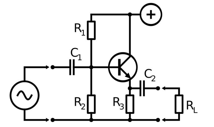 Keywords: Common collector amplifier.svg Diagram showing the common collector type of amplifier stage utilizing a bipolar transistor own 2007-02 FDominec PD ElCompLib Inkscape Common-collector amplifier circuits