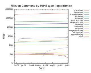 | Keywords: Commons MIME statistics files 2008-11-23 to 2009-07-06.svg en A logarithmic plot of the number of files on Commons by MIME type from formatdate 2008-11-23 to formatdate 2009-07-06 as gathered by MIMEStatBot own ; plotted with gnuplot based on raw data at http //toolserver org/~vyznev/stats/commons_mime_statistics_data txt Ilmari Karonen 2009-07-06 <gallery> File Commons MIME statistics bytes 2008-11-23 to 2009-07-06 svg By total size in bytes </gallery> Other fields G + Notes Ogg audio and video files are listed as audio/ogg and video/ogg respectively even though the database currently lists both as application/ogg The image/x-xcf counts include files listed as unknown/unknown since they seem to be almost exclusively XCF files The application/zip files are almost exclusively OpenOffice documents Files of type image/x-ms-bmp have been listed separately despite not being an officially allowed file format on Commons since a considerable number of them still remain cc-zero Data in tabular format wikitable Date image/jpeg image/png image/svg+xml audio/ogg image/gif application/pdf image/vnd djvu video/ogg audio/midi image/tiff image/x-ms-bmp image/x-xcf application/zip Other - align right left formatdate 2008-11-23 2 709 604 408 281 205 041 92 154 96 267 2 872 2 328 2 124 1 097 0 182 117 103 102 - align right left formatdate 2008-11-30 2 736 523 409 799 206 341 92 247 89 830 2 922 2 444 2 138 1 101 0 182 115 103 103 - align right left formatdate 2008-12-07 2 789 692 411 383 207 443 92 421 89 247 2 982 2 505 2 174 1 103 0 182 115 103 103 - align right left formatdate 2008-12-14 2 862 198 413 373 208 535 92 557 89 559 5 180 2 539 2 205 1 109 0 182 116 103 103 - align right left formatdate 2008-12-21 2 881 496 415 464 209 640 92 651 90 200 5 222 2 606 2 218 1 109 0 181 115 103 103 - align right left formatdate 2008-12-28 2 900 181 417 469 210 435 92 675 90 360 5 673 2 626 2 226 1 108 0 181 115 103 102 - align right left formatdate 2009-01-04 2 928 187 419 190 211 995 92 719 89 729 6 034 2 675 2 248 1 109 0 180 114 103 102 - align right left formatdate 2009-01-11 2 952 532 421 062 213 268 92 838 89 981 6 069 2 708 2 279 1 112 0 180 115 103 101 - align right left formatdate 2009-01-18 2 975 414 422 391 214 549 92 913 90 319 6 102 2 731 2 296 1 112 0 179 116 102 103 - align right left formatdate 2009-01-25 2 997 929 424 192 216 607 92 988 89 654 6 148 2 752 2 348 1 134 0 177 115 102 98 - align right left formatdate 2009-02-01 3 023 924 427 055 218 408 93 091 88 385 6 252 2 801 2 379 1 113 0 175 116 102 97 - align right left formatdate 2009-02-08 3 050 139 428 891 219 531 93 200 88 849 6 342 2 841 2 432 1 115 0 175 119 102 95 - align right left formatdate 2009-02-15 3 079 328 431 526 220 838 93 230 89 408 6 413 2 908 2 457 1 117 0 175 118 102 94 - align right left formatdate 2009-02-22 3 108 537 433 710 222 130 93 497 89 921 6 441 2 995 2 474 1 120 0 175 122 102 95 - align right left formatdate 2009-03-01 3 134 020 436 209 224 569 93 818 90 385 6 471 3 026 2 500 1 124 0 175 121 102 94 - align right left formatdate 2009-03-08 3 171 980 438 137 225 868 93 970 90 687 6 498 3 068 2 557 1 127 0 175 122 102 94 - align right left formatdate 2009-03-15 3 243 280 439 944 227 909 94 032 90 679 6 515 3 126 2 596 1 126 0 174 122 102 94 - align right left formatdate 2009-03-22 3 275 339 441 702 242 082 94 126 91 055 6 555 3 191 2 633 1 134 55 174 126 102 93 - align right left formatdate 2009-03-29 3 301 394 443 599 243 489 94 280 91 419 6 604 3 215 2 648 1 135 139 174 126 102 95 - align right left formatdate 2009-04-05 3 333 688 445 199 244 706 94 417 91 717 6 633 3 247 2 675 1 136 181 174 127 102 94 - align right left formatdate 2009-04-12 3 385 695 446 608 245 850 94 541 91 976 6 773 3 272 2 698 1 136 224 174 128 102 97 - align right left formatdate 2009-04-19 3 429 031 448 123 246 884 95 050 92 250 6 811 3 326 2 718 1 138 264 174 129 103 96 - align right left formatdate 2009-04-26 3 457 731 449 949 248 266 95 071 92 706 6 861 3 424 2 768 1 141 296 170 129 103 95 - align right left formatdate 2009-05-03 3 484 642 452 189 249 612 96 029 93 082 6 873 3 665 2 811 1 132 320 169 130 103 94 - align right left formatdate 2009-05-10 3 511 879 454 200 251 091 96 247 93 363 6 913 3 723 2 821 1 122 349 169 134 102 86 - align right left formatdate 2009-05-17 3 536 520 455 914 251 984 96 446 93 541 6 947 3 749 2 855 1 123 377 169 134 102 85 - align right left formatdate 2009-05-24 3 565 698 457 605 253 219 96 908 93 749 6 966 3 773 2 875 1 123 421 141 134 102 81 - align right left formatdate 2009-05-31 3 590 854 459 731 254 574 97 181 94 111 6 982 3 809 2 917 1 125 437 141 134 102 72 - align right left formatdate 2009-06-07 3 614 875 461 982 255 647 97 307 94 356 7 004 3 973 2 935 1 128 463 140 134 102 73 - align right left formatdate 2009-06-14 3 644 797 466 827 256 978 97 584 94 690 7 009 4 074 2 984 1 132 497 140 138 102 68 - align right left formatdate 2009-06-21 3 669 390 477 192 258 158 97 995 95 025 7 033 4 194 3 009 1 144 523 140 140 103 71 - align right left formatdate 2009-06-28 3 695 643 486 689 259 510 98 269 95 178 7 072 4 276 3 063 1 147 548 139 138 103 48 - align right left pages with source data |