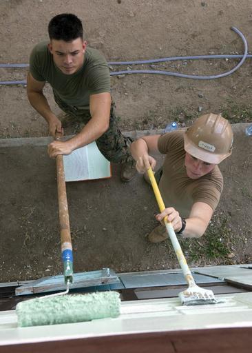 Keywords: Community relations project at Banklong Sai Elementary School DVIDS154624.jpg en Cpl James Anderson from Aurora Colo left and equipment operator constructionman Diton Parker from Paris Mo both assigned to Combat Logistics Regiment 3 of the 31st Marine Expeditionary Unit paint a wall during a community relations activity at Banklong Sai Elementary School as part of Exercise Cobra Gold 09 an annual Thailand and U S co-sponsored joint coalition multinational military exercise designed to train a Thai U S and Singaporean Coalition Task Force The exercise will also include humanitarian civic action projects with participating nations from Indonesia Japan Singapore Thailand and the U S 2009-02-12 Seaman Gabriel Weber https //www dvidshub net/image/154624 090212-N-+++++-006 2009-03-04 00 49 UTAPHAO TH PD-USGov-Military-Navy 31st Marine Expeditionary Unit Images from DoD uploaded by Fæ |