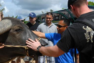 Keywords: Community relations project in Thailand DVIDS206980.jpg en Sailors aboard the aircraft carrier USS Ronald Reagan touch a water buffalo during the Phuket city explorer Moral Welfare and Recreation sponsored tour Sailors engaged themselves in Phuket's culture by participating in community relation projects MWR sponsored tours and sporting events with locals The Ronald Reagan Carrier Strike Group is on a routine deployment in the 7th Fleet area of responsibility Operating in the Western Pacific and Indian Ocean the U S 7th Fleet is the largest of the forward-deployed U S fleets covering 52 million square miles with approximately 50 ships 120 aircraft and 20 000 Sailors and Marines assigned at any given time 2009-09-23 Petty Officer 3rd Class Amanda Ray https //www dvidshub net/image/206980 090923-N-+++++-024 2009-09-28 04 29 PHUKET TH PD-USGov-Military-Navy USS Ronald Reagan CVN-76 Images from DoD uploaded by Fæ |