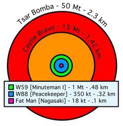 | Keywords: Comparative nuclear fireball sizes.svg Tsar Bomba ” 50 Mt ” convert 4 6 km 1 on Castle Bravo ” 15 Mt ” 2 84 km 2 on W59 warhead Minuteman missile ” 1 Mt ” 96 km 2 on W88 warhead Peacekeeper missile ” 350 kt ” 64 km 1 on Fat Man bomb dropped on Nagasaki Japan ” 18 kt ” 2 km 1 on Note that these are only for the fireball component of the explosion ” radiation blast and heat would extend far beyond these distances i e for the Tsar Bomba anyplace with 6 56 km would receive 500 rems of radiation there would be near total fatalities for the air blast within 9 95 km structural damage at 26 26 km and third-degree burns at 58 km This is meant only to give some means of comprehending the differences in scale between different weapon designs Tsar Bomba ” 50 Mt ” 4 6 km Castle Bravo ” 15 Mt ” 2 84 km W59 ydinkärki Minuteman ohjus ” 1 Mt ” 96 km W88 ydinkärki Peacekeeper ohjus ” 350 kt ” 64 km Fat Man pommi pudotettiin Nagasakiin ” 18 kt ” 2 km Huomaa että esitettynä on vain tulipallojen säde ” radioaktiivinen laskeuma paineaalto ja kuumuus leviävät huomattavasti näitä etäisyyksiä kauemmaksi Fastfission Sizes calculated using the equations at Carey Sublette's http //nuclearweaponarchive org/Nwfaq/Nfaq5 html Nuclear Weapons Archive FAQ Created with Inkscape 2006-06-25 Fastfission If you want to credit someone credit Wikimedia Commons Otherwise don't credit anyone that's fine by me --Fastfission 14 59 14 April 2008 UTC Fastfission Nuclear explosion physics Nuclear weapons data Castle Bravo Fat Man Tsar Bomba |