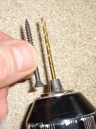 Keywords: Comparing drill point diameter and length with screw.JPG en What size drill point A quick and easy way is to compare the barrel of the drill point right with the barrel of the screw -- that is assume the corkscrew threads are not there -- and strive for the same barrel diameter Here I am eyeballing them both The drill point at right will work although it is a tad thin; if the screw was much longer the barrel should be as thick as the screw's barrel otherwise the screw will SQUEAK and have trouble going in The idea of pre-drilling is that it reduces the likelihood that the wood will crack when the screw is drilled in The idea is the screw's threads should grip the wood Another tip aligning the length of the point with the screw length can be helpful This particular screw has a narrow head useful for holding molding or floor boards 2010-01-14 06 40 35 own Tomwsulcer cc-zero Uploaded with UploadWizard Handyman photos by tom sulcer Drill bits Screws fastener |