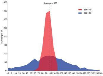 Keywords: Comparison standard deviations.svg en Example of two samples with the same mean and different standard deviations Red sample has mean 100 and SD 10; blue sample has mean 100 and SD 50 Each sample has 1000 values drawn at random from a gaussian distribution with the specified parameters own JRBrown 2010-07-01 Comparació de desviacions tipus svg Desbideratze estandarra alderatuz 01 svg Standard deviation Frequency polygons Normal distribution |