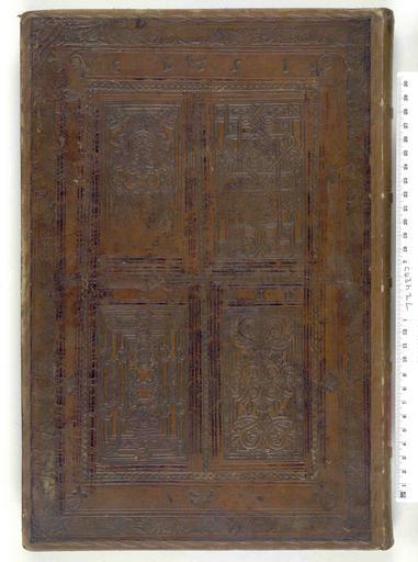 Keywords: Compendiosa totius Anatomie delineatio, - Lower cover (c43h2).jpg Style Panel design Dated; Caption Lower cover; Colour Brown; Edge Unspecified exhibition history Decorative Technique Panel stamp in blind Tooled in blind; Cover Material Calf This may well be tooled in gold not blind Possibly bound in Saxony or Tubingen Macchi states; A very similar altough not identical panel-stamp example upper cover 1 st top right; lower cover 3 rd bottom left is reproduced in M Von Arnim's Einbandkunst n 46 on Martin Luther Eine einfeltige weise zu beten für einen guten Freund Leipzig Valentin Baptist 1551 An analogous cover bound in Tübingen by the Jakob Andreä Master kept in the Biblioteca Apostolica Vaticana I Schunke Die Einbände der Palatina pl IC no text is reproduced in M von Arnim's Einbandkunst n 70 on Jean Jacques Boissard Emblematum liber Frankfurt M Theodor de Bry 1593 too The layout is analogous but the background is richer in the second panel-stamp kind I Schunke refers in this last case to a Samuel Streler see C 24 a 18 C 65 l 9 successor because of the bindings he produced for the Tübingen theologian Jakob Andreä 1528-1590 object history Text 1553; London; Unspecified object type Cc-zero place of creation Binding Germany place of discovery Unspecified British Library image http //www bl uk/catalogues/bookbindings/LargeImage aspx RecordId 020-000006232 ImageId ImageId 42721 Copyright BL Compendiosa totius Anatomie delineatio Uploaded with GWToolset Compendiosa totius Anatomie delineatio - Lower cover c43h2 http //www webarchive org uk/bldatasets/bindings/7872_4 jpg Bookbinding 16th-century bookbinding |
