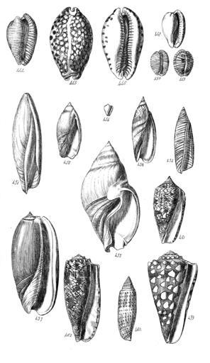 Keywords: Conchological Manual Plate 21.png Plate Fig 444 to 462 Names see below are as used in the 1842 text gutenberg A Conchological Manual 43417 1842 George Brettingham Sowerby II 1812 “1884 PD-art-100 <table> <tr><td style font-size 80 > FIG </td> <tr><td style line-height 150 ; text-align center; colspan 2 > <i>Fam </i> Convolutæ </td></tr> <tr><td> 444 </td> <td> Cypræovulum capense </td></tr> <tr><td> 445 </td> <td> Cypræa arabica back </td></tr> <tr><td> 446 </td> <td> The same front </td></tr> <tr><td> 447 </td> <td> Cypræa Algoensis Luponia Gray front </td></tr> <tr><td> 449 </td> <td> Pediculus Trivia Gray back </td></tr> <tr><td> 450 </td> <td> The same front </td></tr> <tr><td> 451 </td> <td> Terebellum convolutum Seraphs Montf </td></tr> <tr><td> 452 </td> <td> subulatum front </td></tr> <tr><td> 454 </td> <td> Erato Mangeriæ </td></tr> <tr><td> 455 </td> <td> Ancillaria glabrata Anolax Brongn </td></tr> <tr><td> 456 </td> <td> cinnamonea </td></tr> <tr><td> 457 </td> <td> Oliva Maura </td></tr> <tr><td> 458 </td> <td> subulata Hiatula Sw </td></tr> <tr><td> 459 </td> <td> Conus nocturnus Rhombus Montf </td></tr> <tr><td> 460 </td> <td> Nussatella Hermes Montf </td></tr> <tr><td> 461 </td> <td> Textile Cylinder Montf </td></tr> <tr><td> 462 </td> <td> geographus Rollus Montf </td></tr> </table> A conchological manual 1842 Cypraea arabica Conus nocturnus Conus nussatella Conus textile Conus geographus |